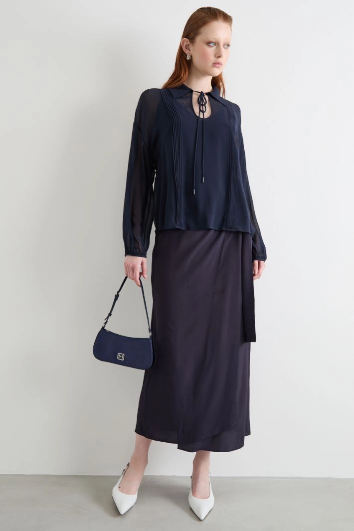 Gonna dalla linea dritta in crepe de chine di misto seta, con inserto elastico in vita e pannello anteriore sovrapposto con fusciacca doppia da annodare.