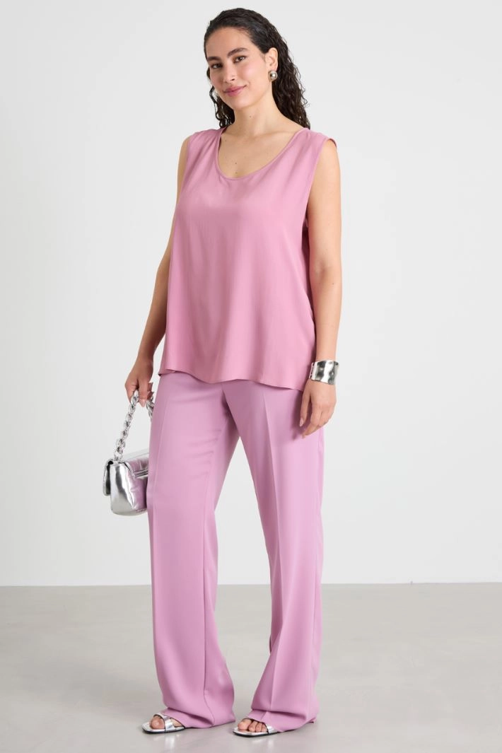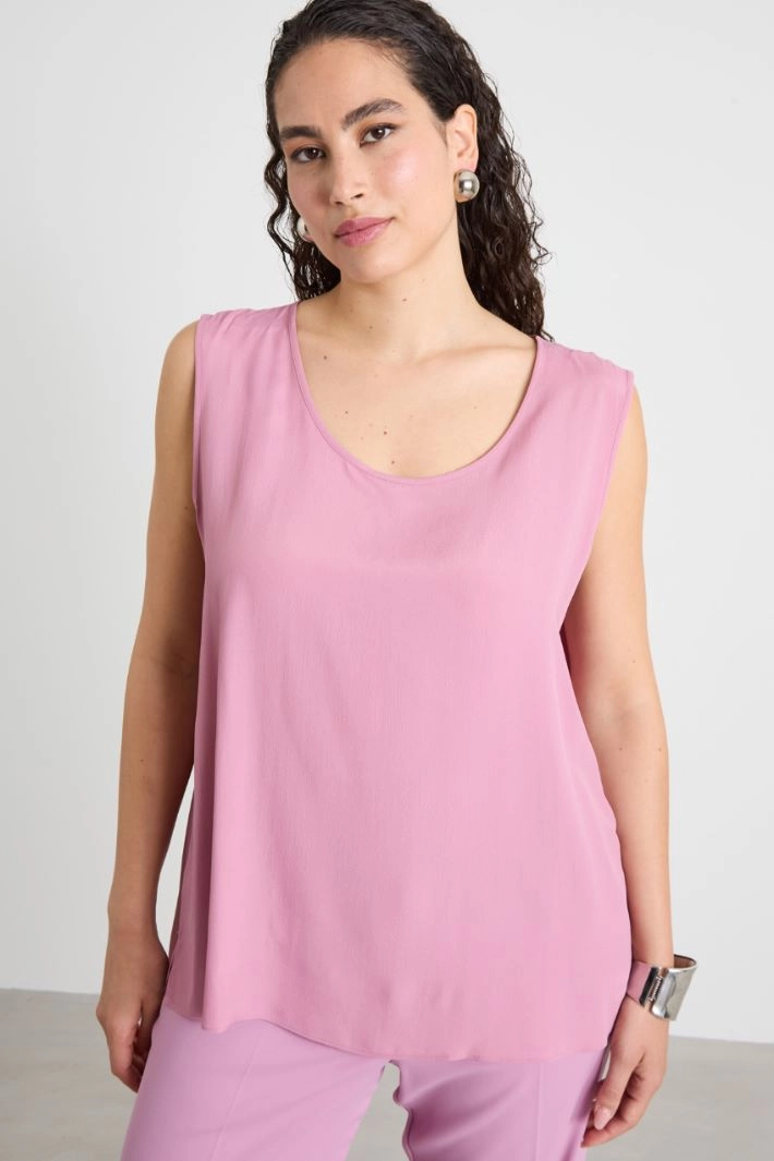Top dalla linea dritta realizzato in crépe, con scollo arrotondato e spacchi laterali a fondo capo.