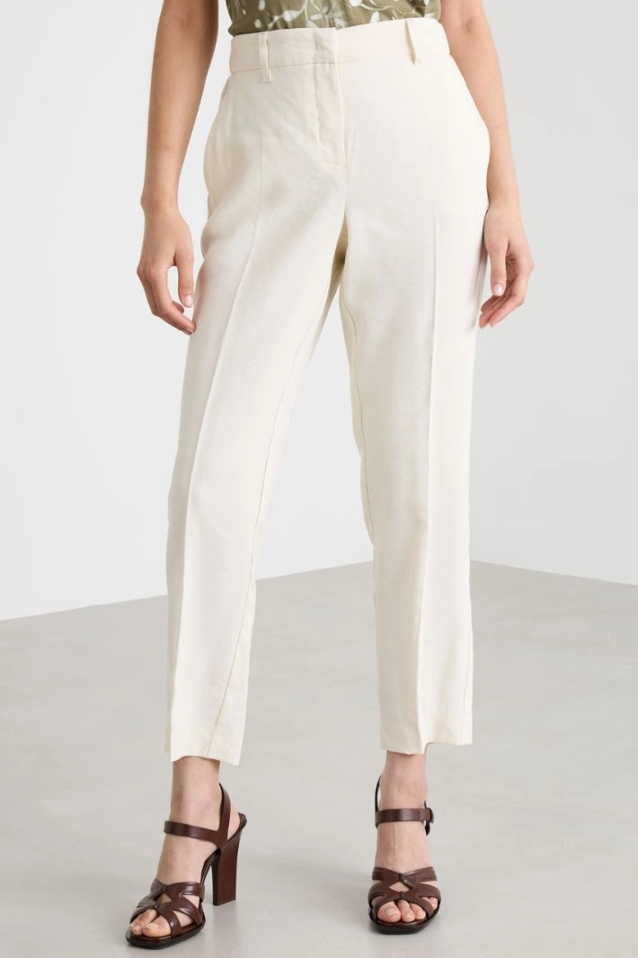 Pantalone dalla linea dritta in viscosa e lino stretch, con inserto elastico sul retro, tasche laterali alla francese e tasche posteriori a filetto. Chiusura con gancio e zip.