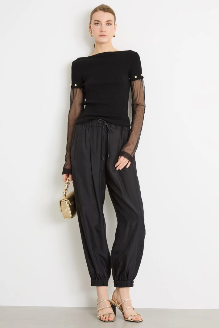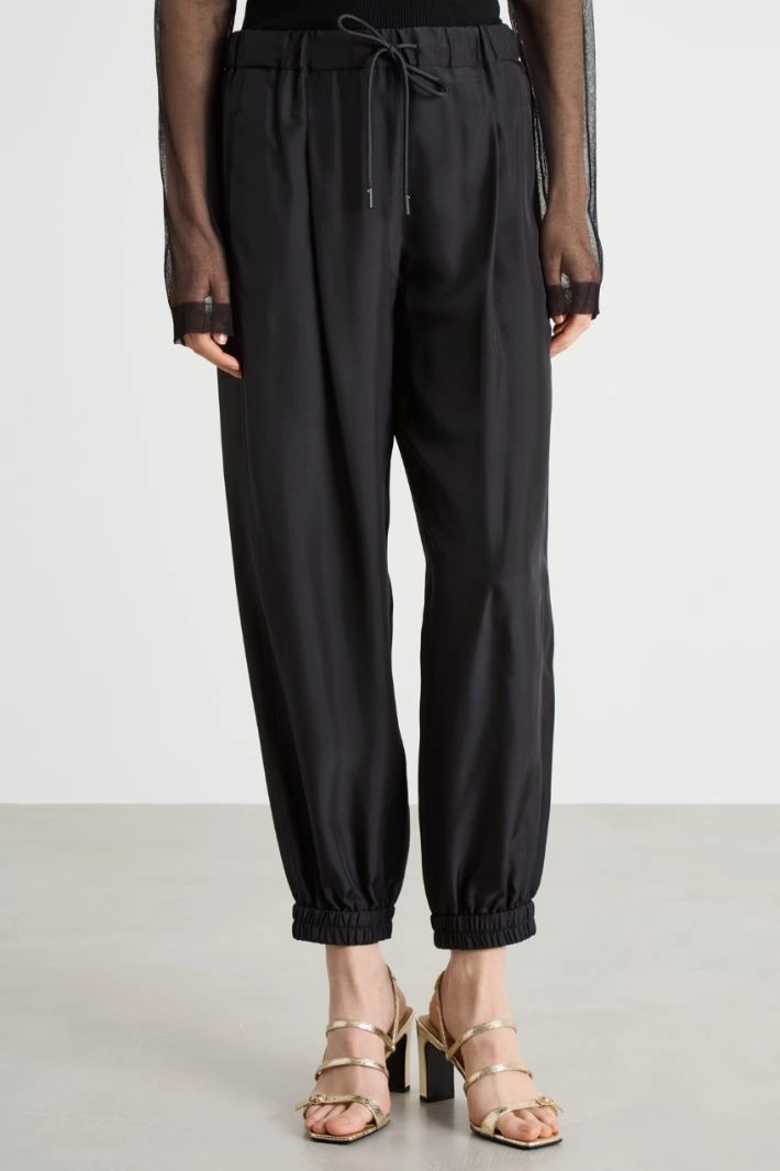 Pantalone stile jogger dalla linea morbida in pura seta habotai, con inserto elastico in vita, coulisse, tasche inserite in cucitura, tasche posteriori a filetto, fondo gamba affusolato con inserto elastico.