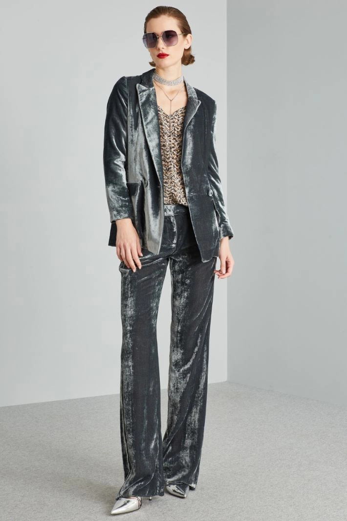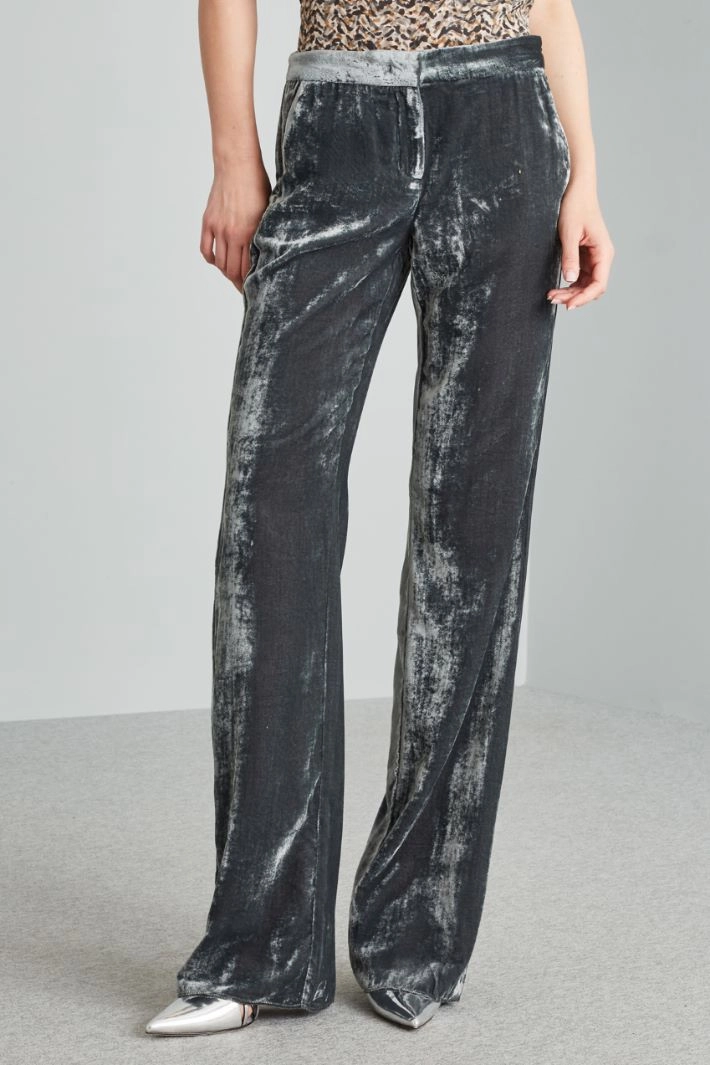 Pantaloni dalla linea morbida realizzati in ciniglia di misto viscosa, con tasche laterali alla francese e allacciatura nascosta tramite zip, bottone e gancio.
