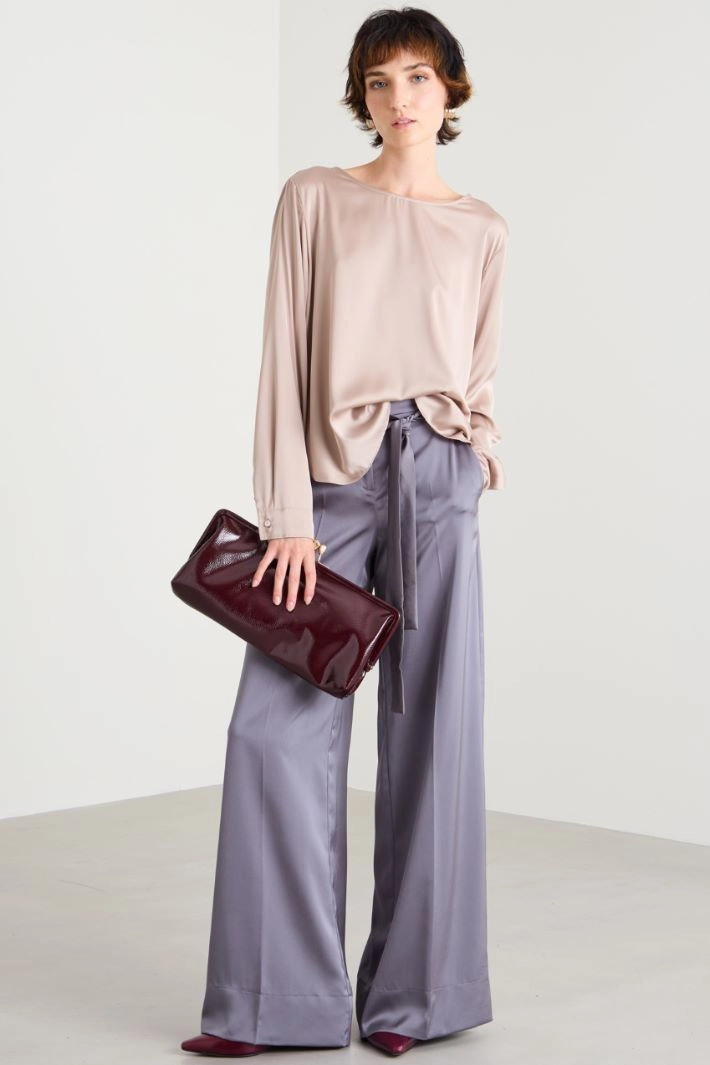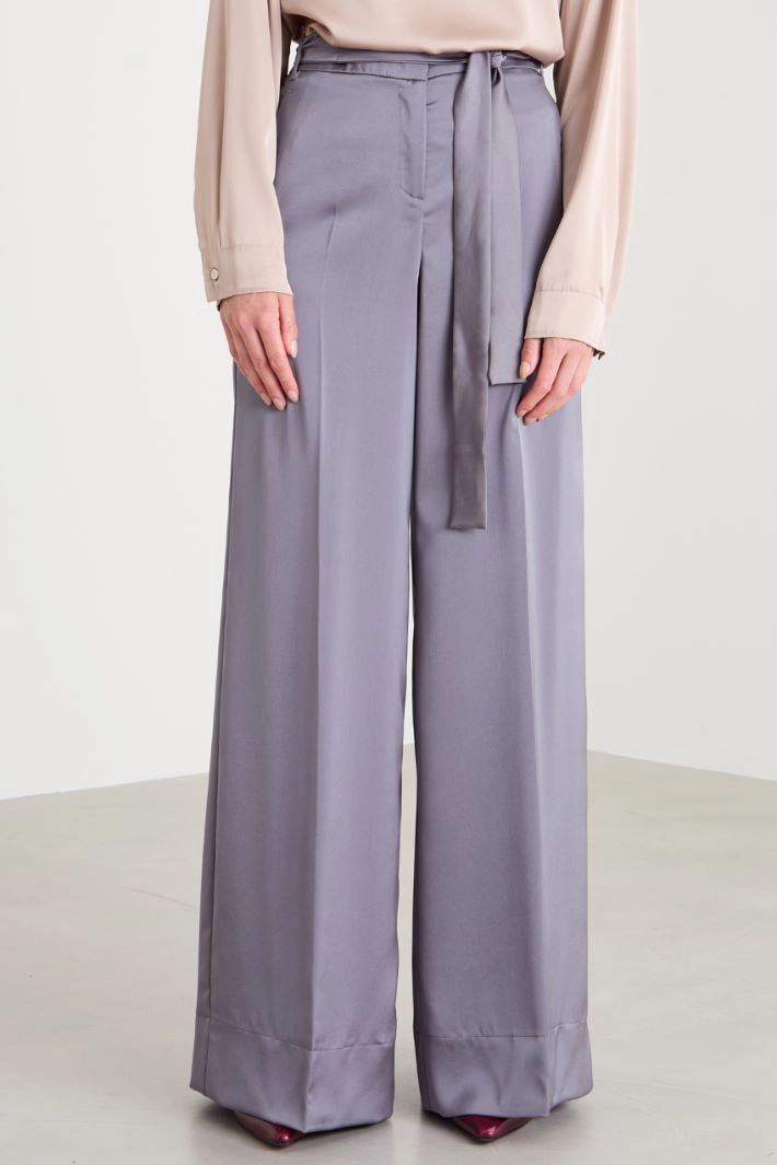 Pantaloni dalla linea dritta realizzati in raso, con passanti, inserto elastico in vita sul retro, tasche laterali alla francese e applicate sul retro, piega stirata in lunghezza e allacciatura nascosta tramite zip, bottone e gancio. Fusciacca coordinata in abbinamento.