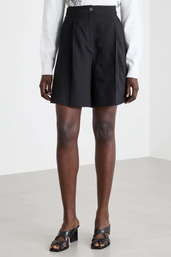 Bermuda dalla linea ampia in viscosa e lino stretch, con pinces e pieghe, tasche alla francese sul davanti, tasche a filetto sul retro. Chiusura con bottone e zip.