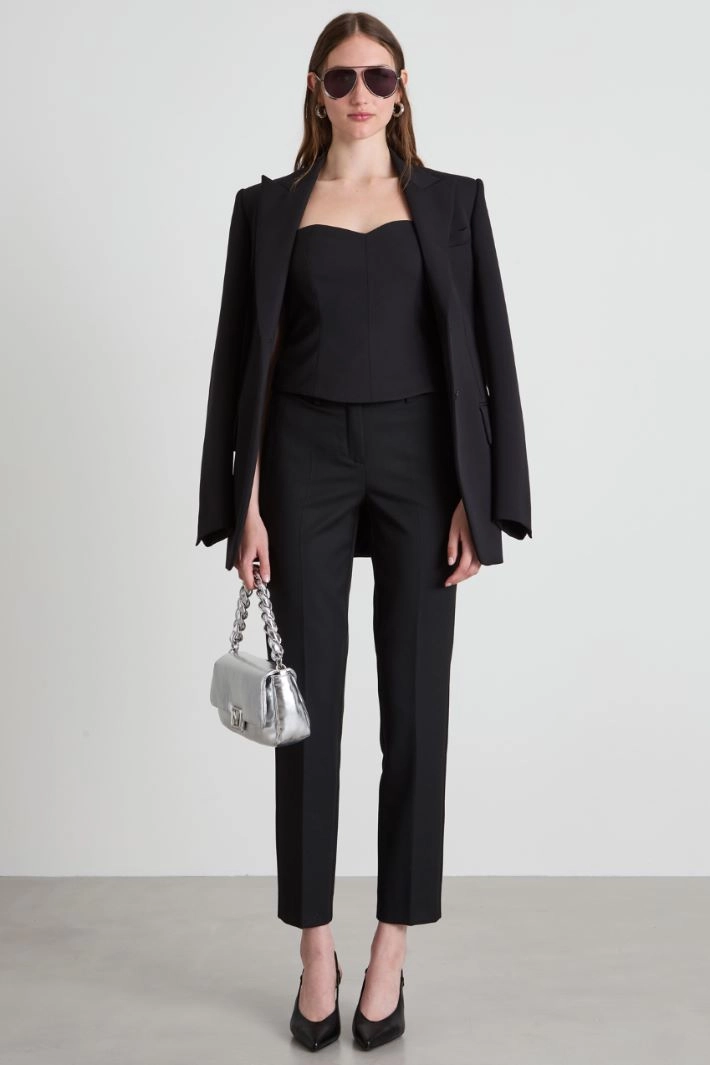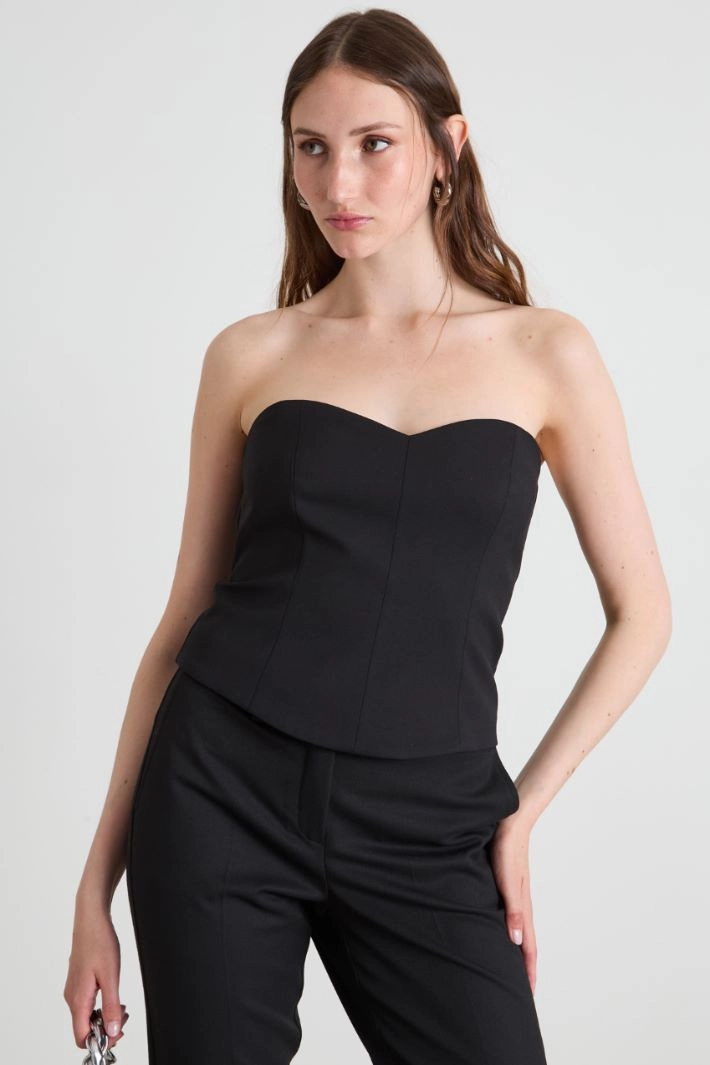 Bustier dalla linea aderente realizzato in gabardina misto lana stretch, con scollo a cuore e allacciatura nascosta tramite zip sul retro. Capo foderato.