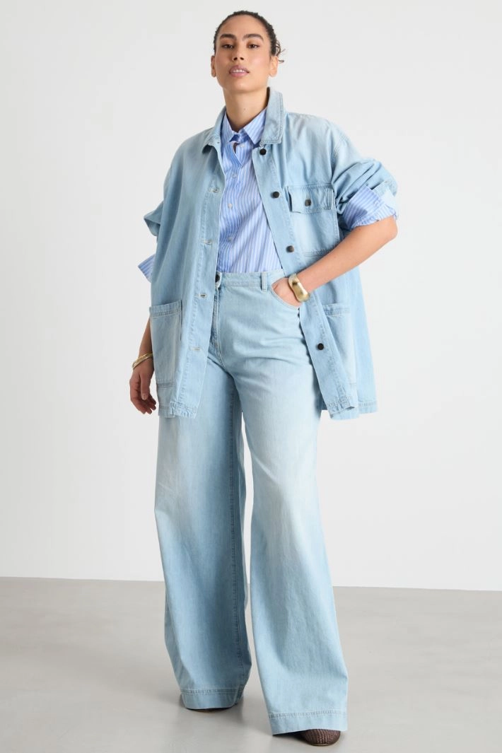 Jeans dalla linea a palazzo con passanti in vita, tasche arrotondate sul davanti, tasche applicate sul retro. Chiusura con bottone e zip nascosta.