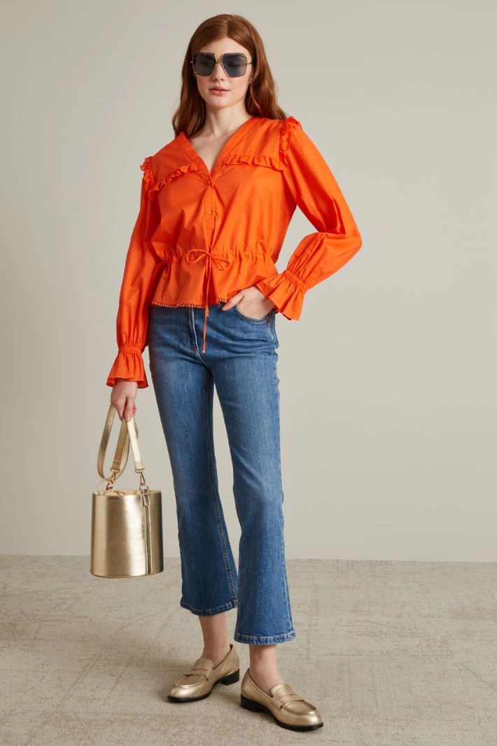 Jeans dalla linea flare realizzati in denim di cotone stretch, con passanti in vita, cinque tasche e allacciatura tramite zip nascosta e bottone.