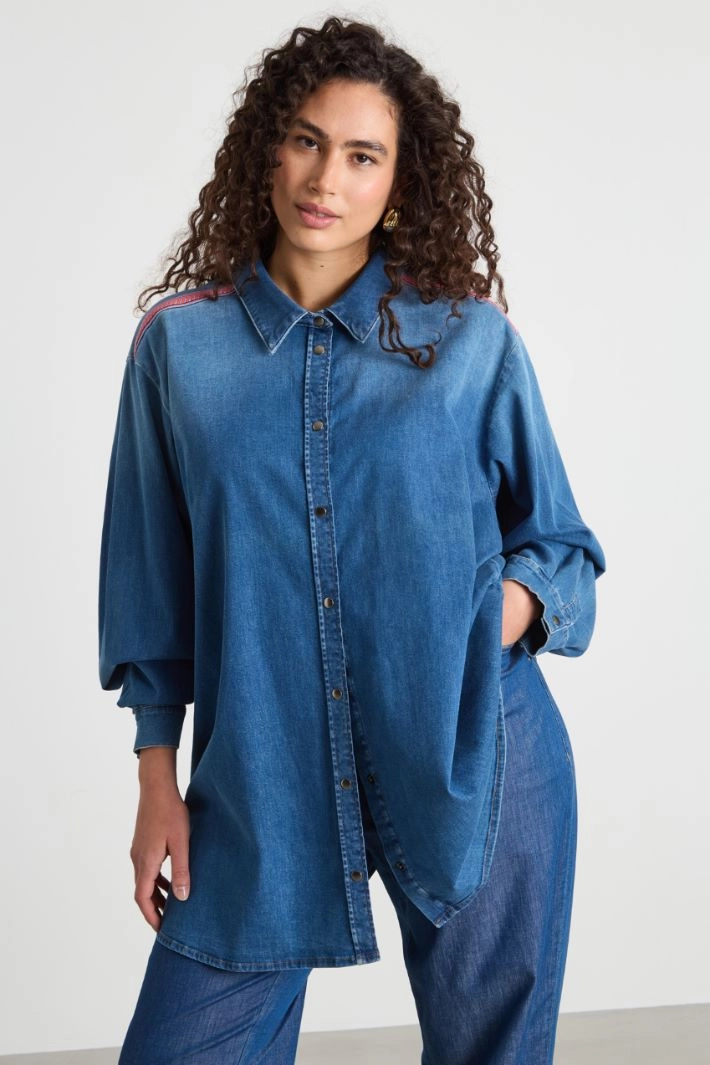 Camicia dalla linea dritta in jeans con colletto a punta, dettagli di passamaneria a contrasto, maniche lunghe a spalla scesa, polsi con bottoni. Taglio carré sul retro Chiusura con bottoni.