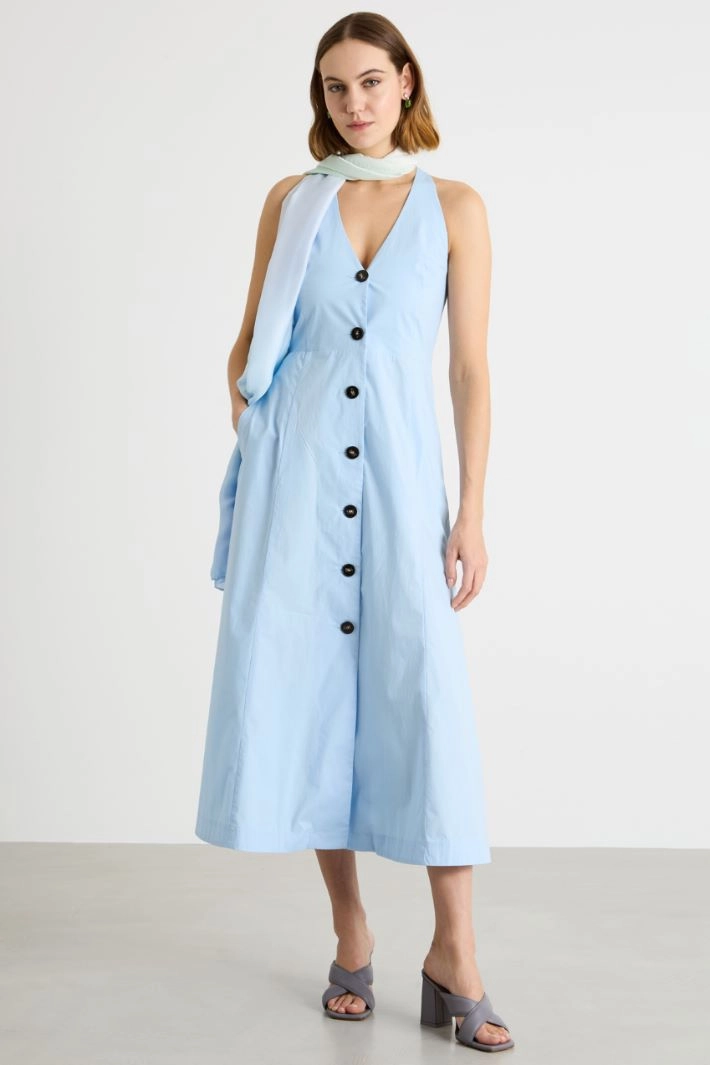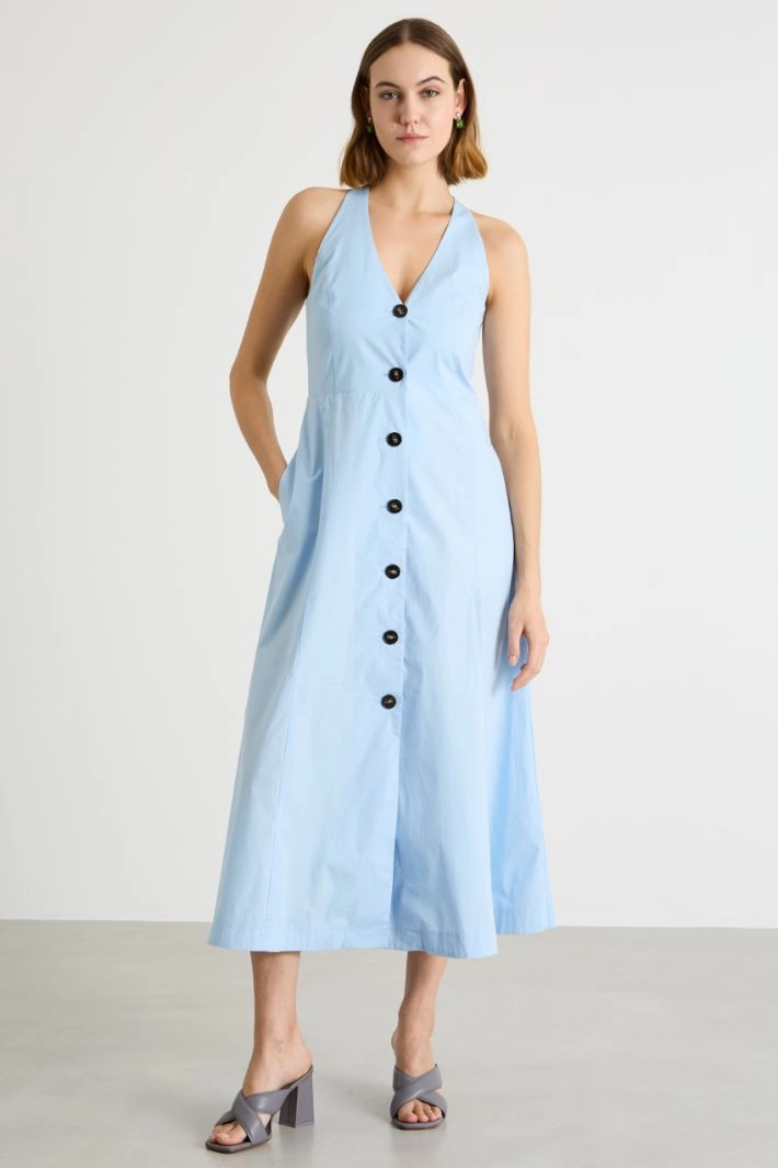 Abito dalla linea aderente in popeline di cotone stretch, con scollo all'americana, cut-out triangolare sul retro, tasche inserite in cucitura. Chiusura con bottoni.