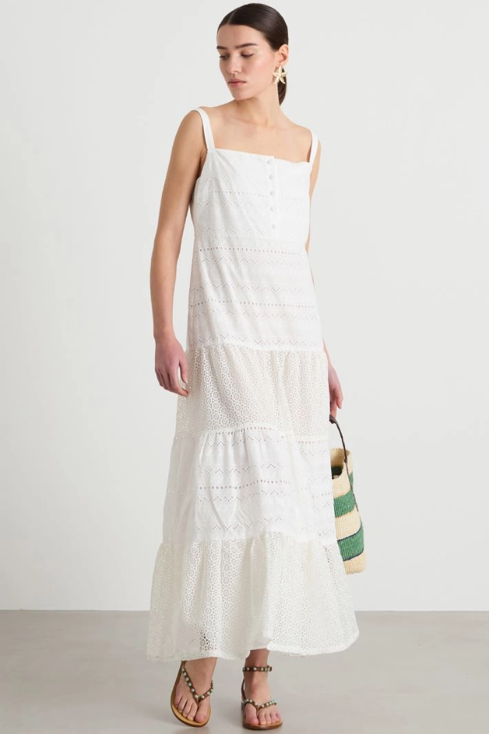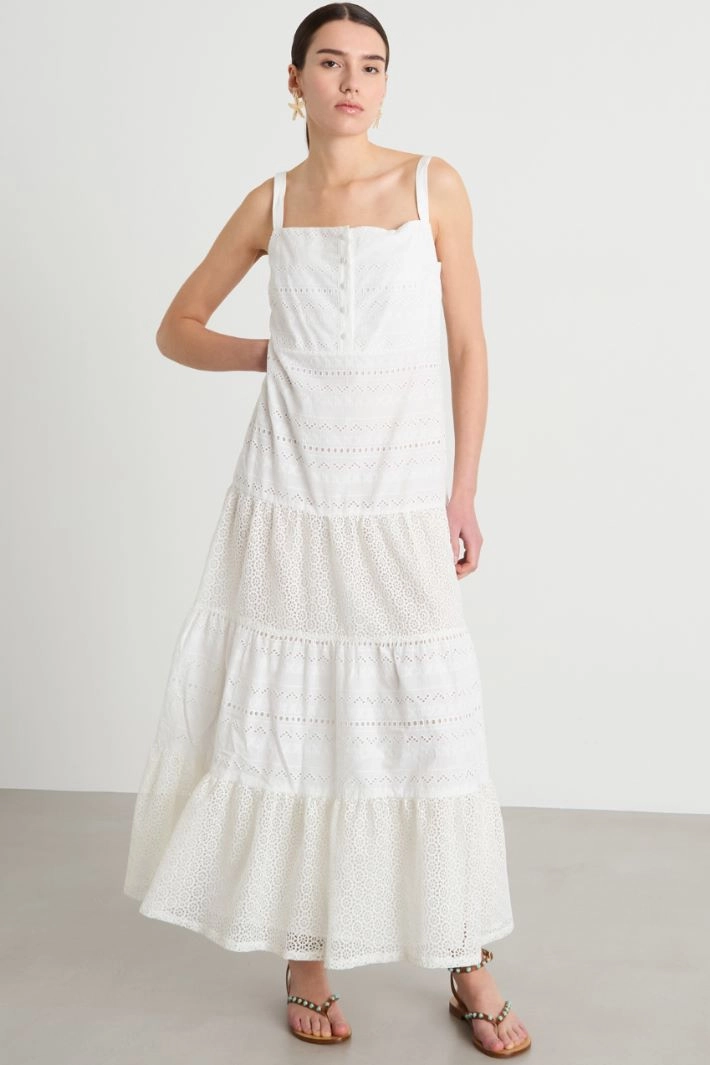 Abito lungo dalla linea svasata in voile di cotone, con scollo squadrato, spalline sottili, gonna con balze arricciate e tessuto a contrasto in macramè. Capo foderato. Chiusura con zip sul retro.