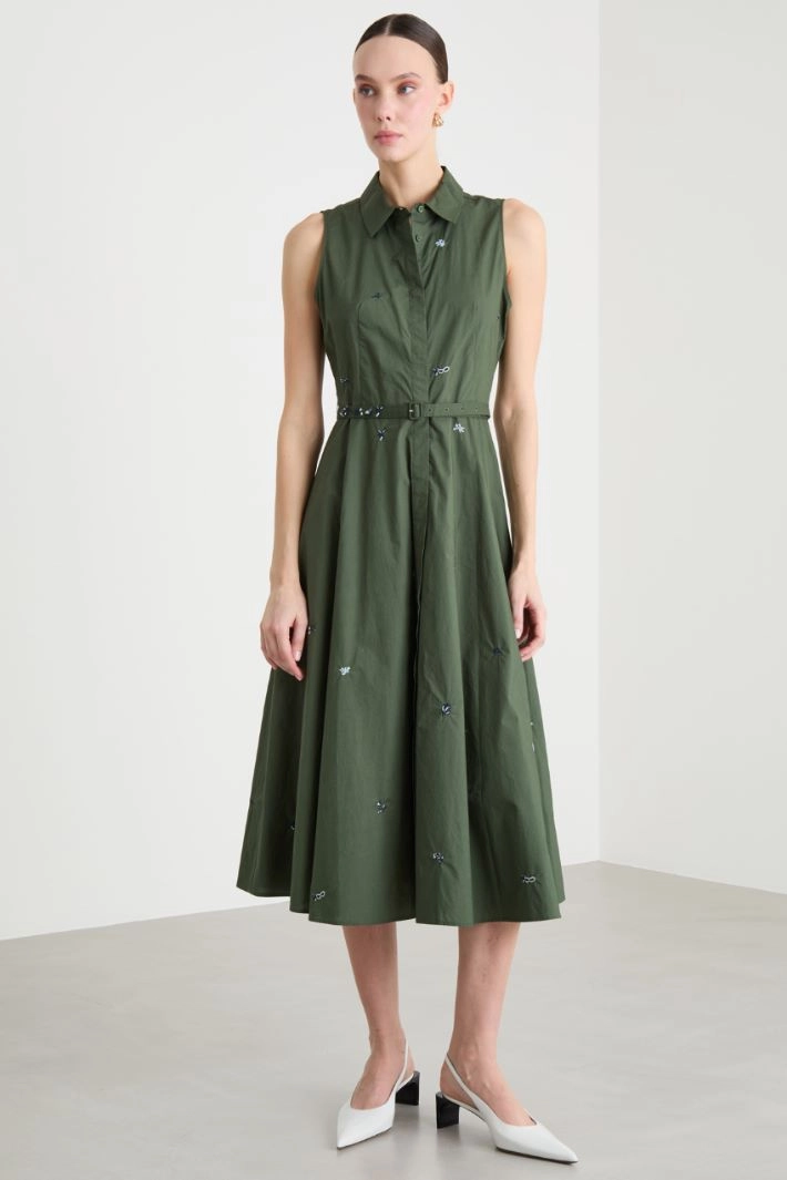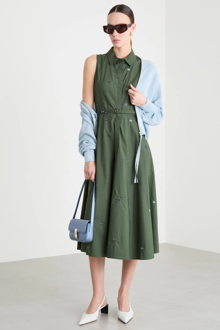 Abito chemisier dalla linea svasata in popeline di cotone ricamato con colletto a punta, taglio in vita e gonna svasata. Chiusura con bottoni e cintura.