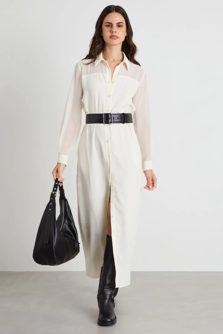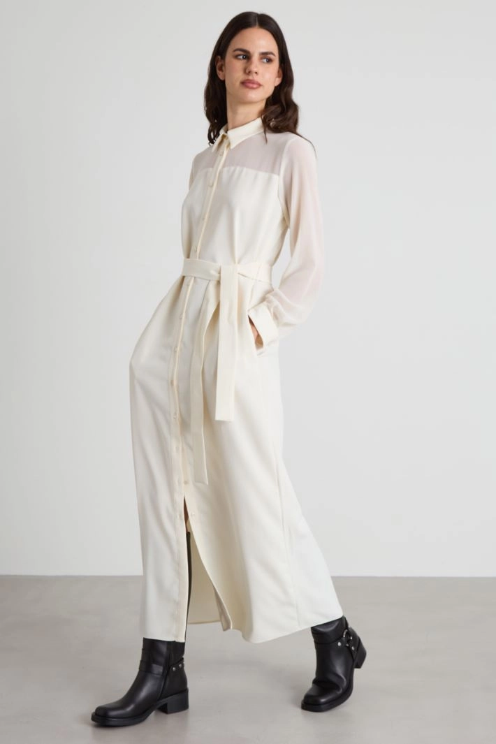 Abito chemisier realizzato in enver satin, con inserto in georgette sulla parte alta del capo, colletto classico, maniche lunghe con polsino e bottone, tasche laterali inserite in cucitura e allacciatura tramite bottoni su tutta la lunghezza. Fusciacca coordinata in abbinamento.