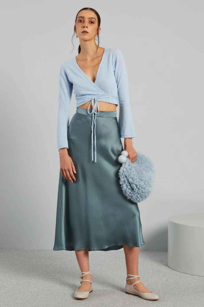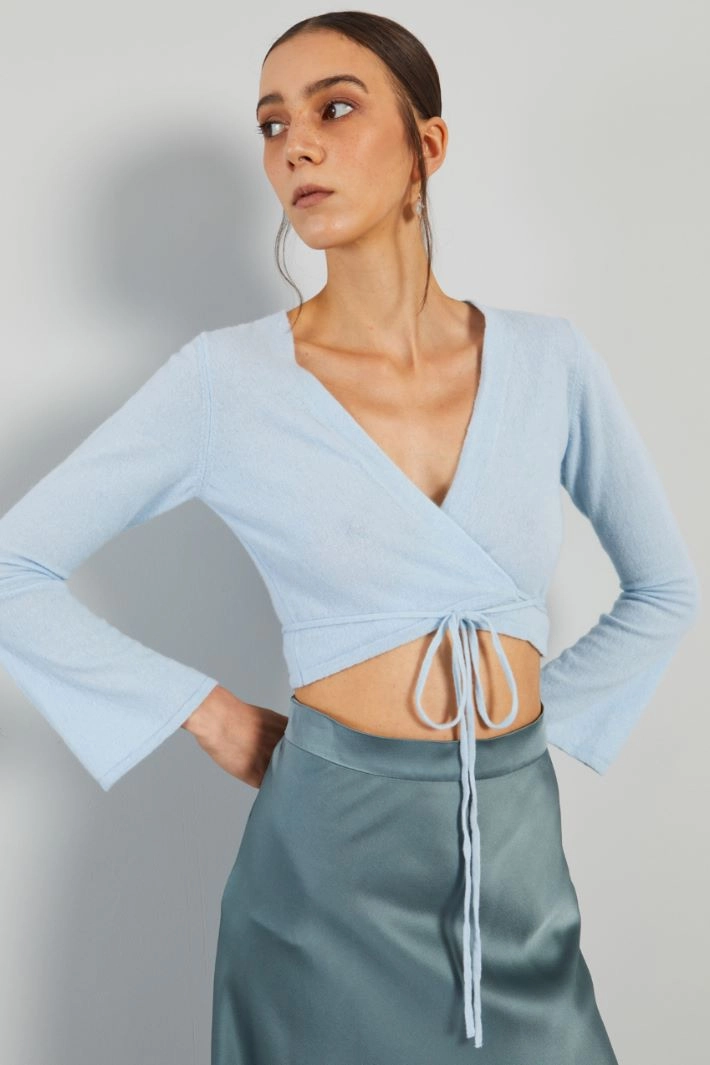 Cardigan corto dalla linea stretta realizzato in filato di pura lana, con scollo a V, maniche lunghe svasate e allacciatura incrociata tramite nastri da annodare in vita.