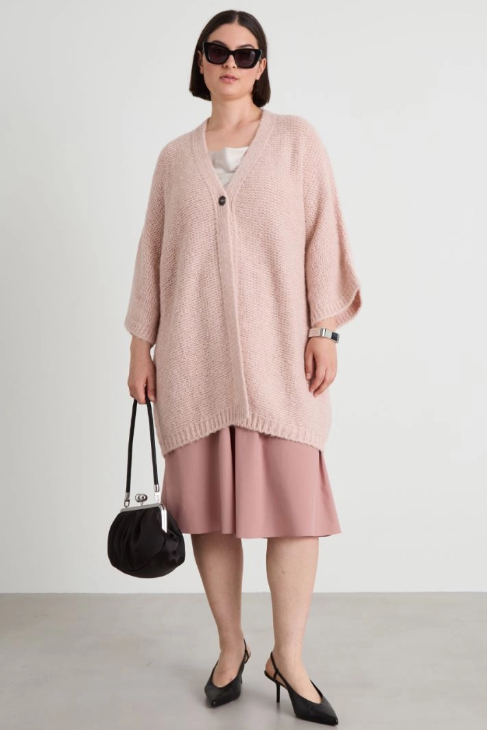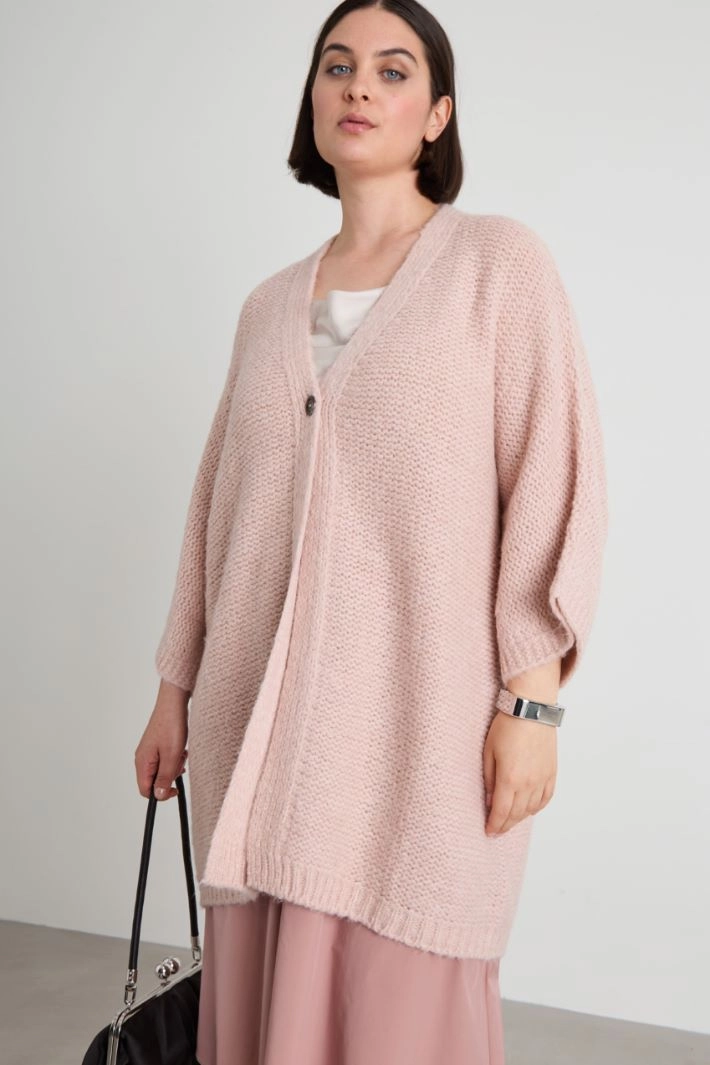 Cardigan dalla linea morbida realizzato in filato di misto lana e viscosa, con scollo a V, maniche tre quarti a kimono e allacciatura tramite bottone.