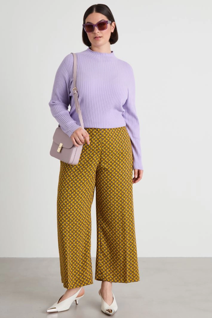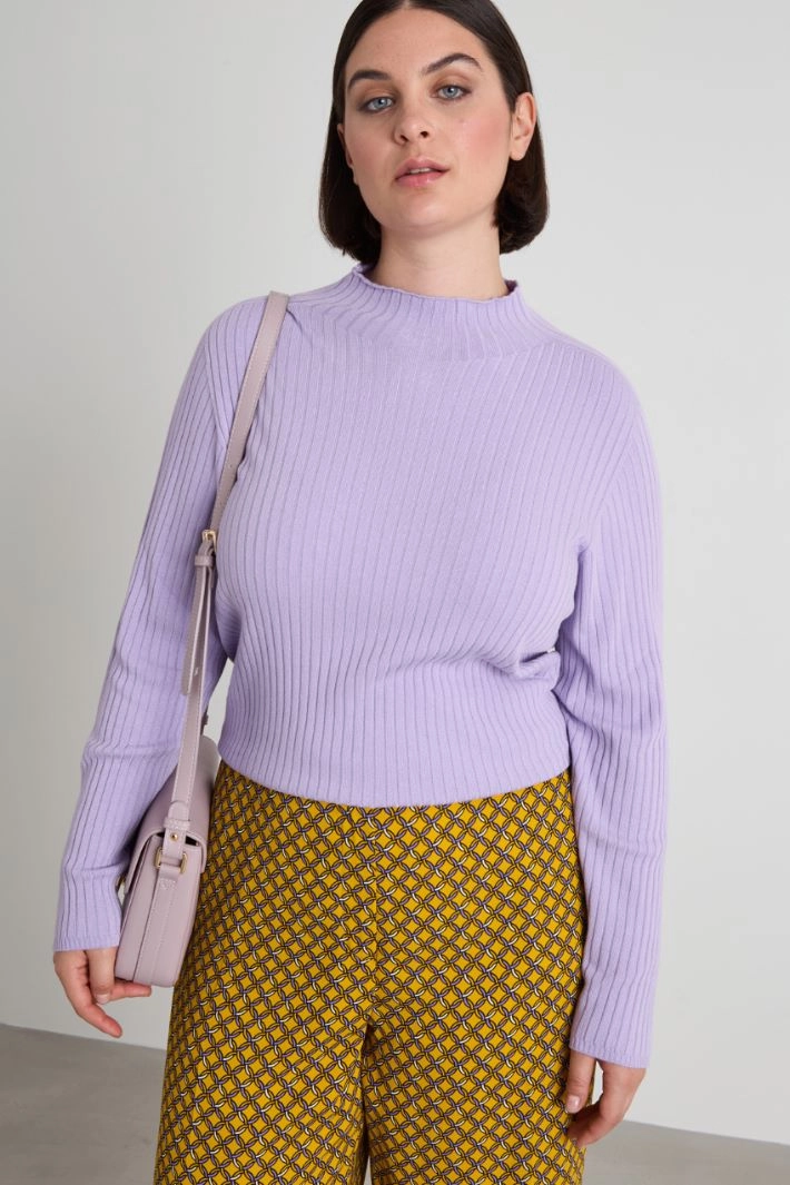 Maglia dalla linea aderente realizzata in filato di viscosa stretch, con collo alto e maniche lunghe.