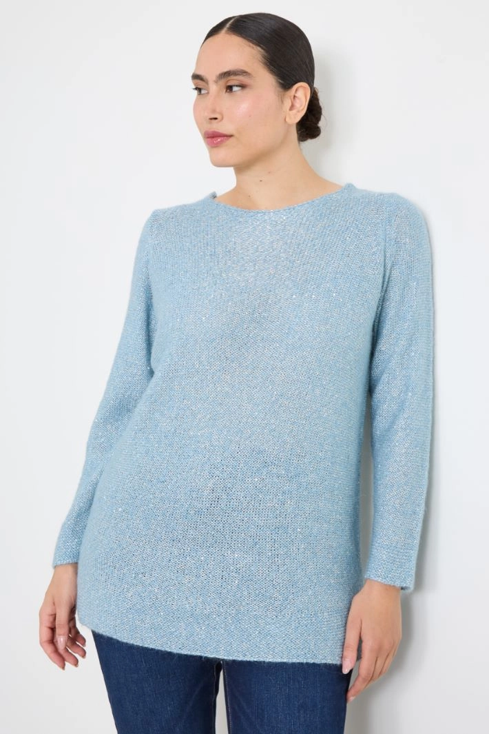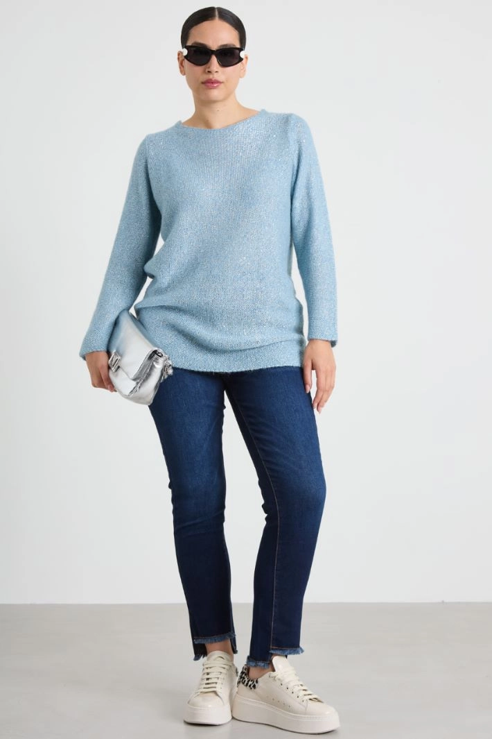 Maglia dalla linea over realizzata in filato con paillettes, scollo a giro, maniche lunghe e spacchi laterali a fondo capo.