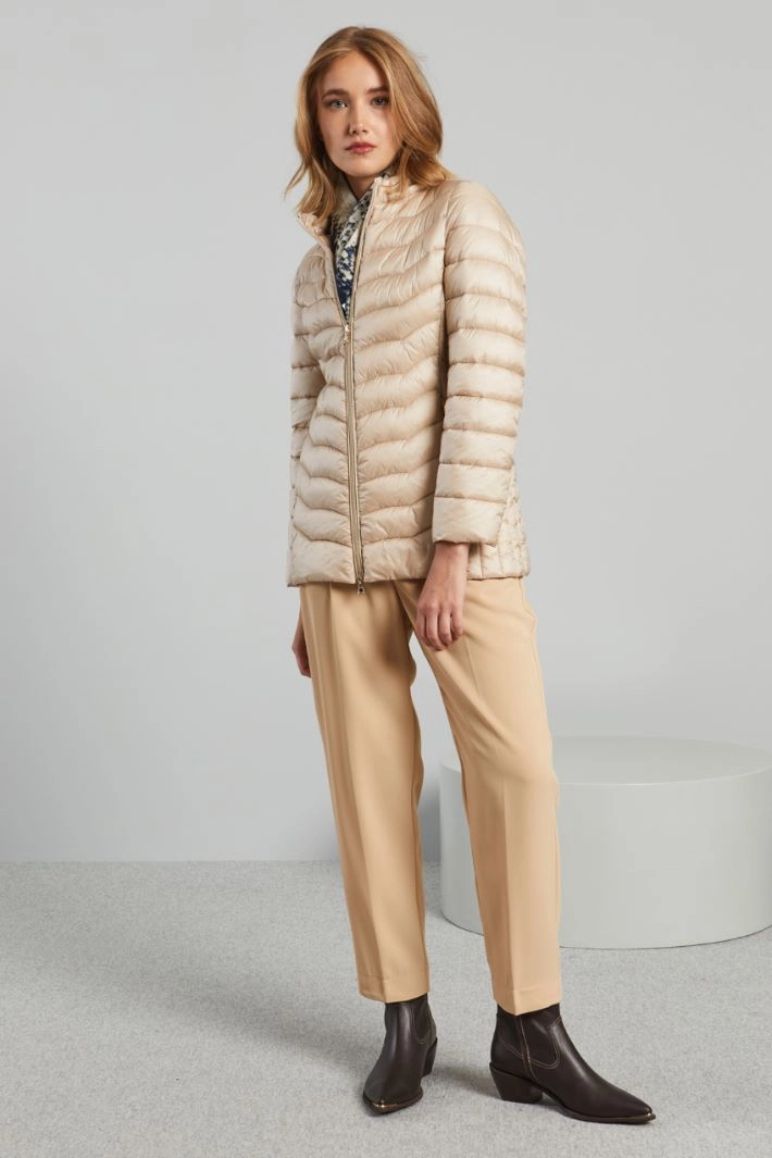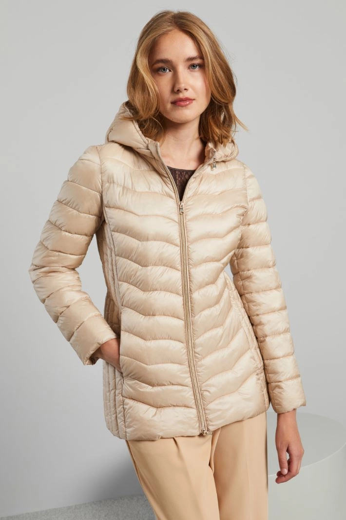 Imbottito dalla linea sfiancata realizzato in raso tecnico trapuntato, con cappuccio removibile, maniche lunghe, tasche laterali con zip e allacciatura tramite zip a doppio cursore sul davanti.