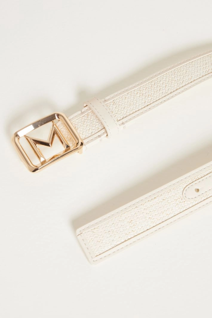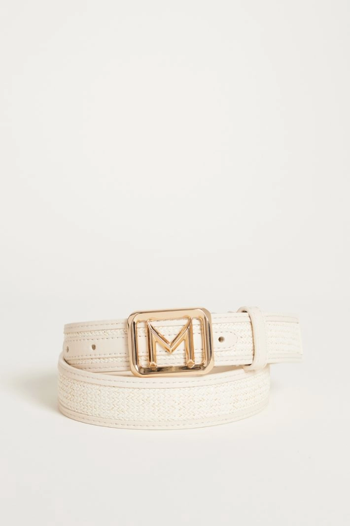 Cintura in rafia con finiture in tessuto spalmato e fibbia in metallo.