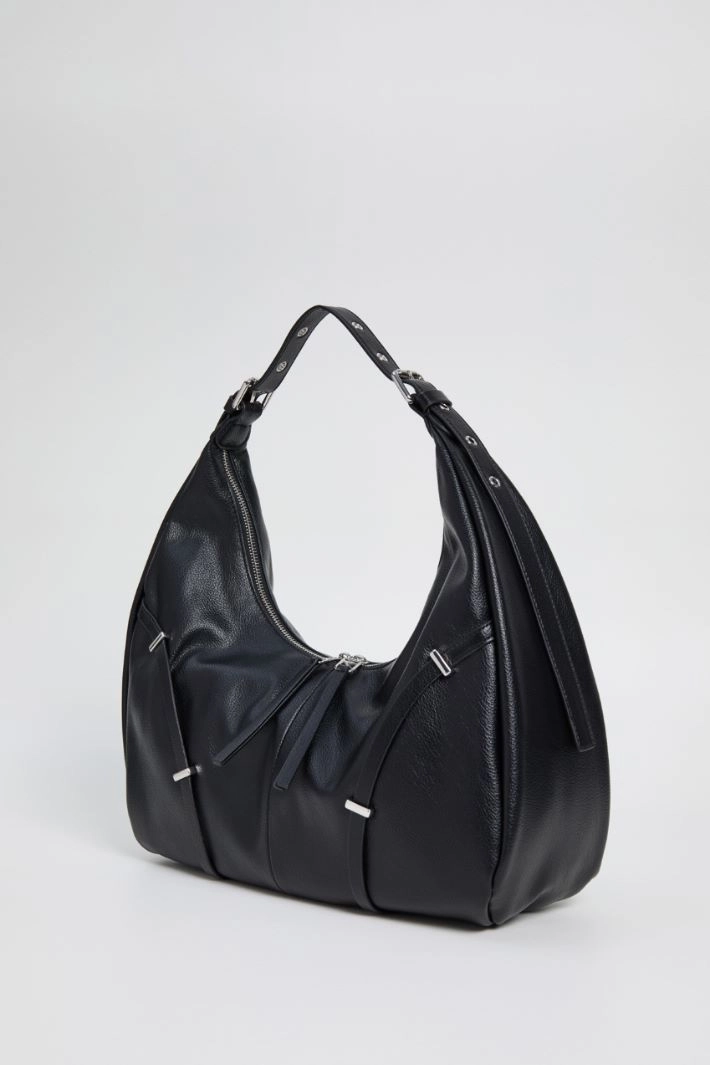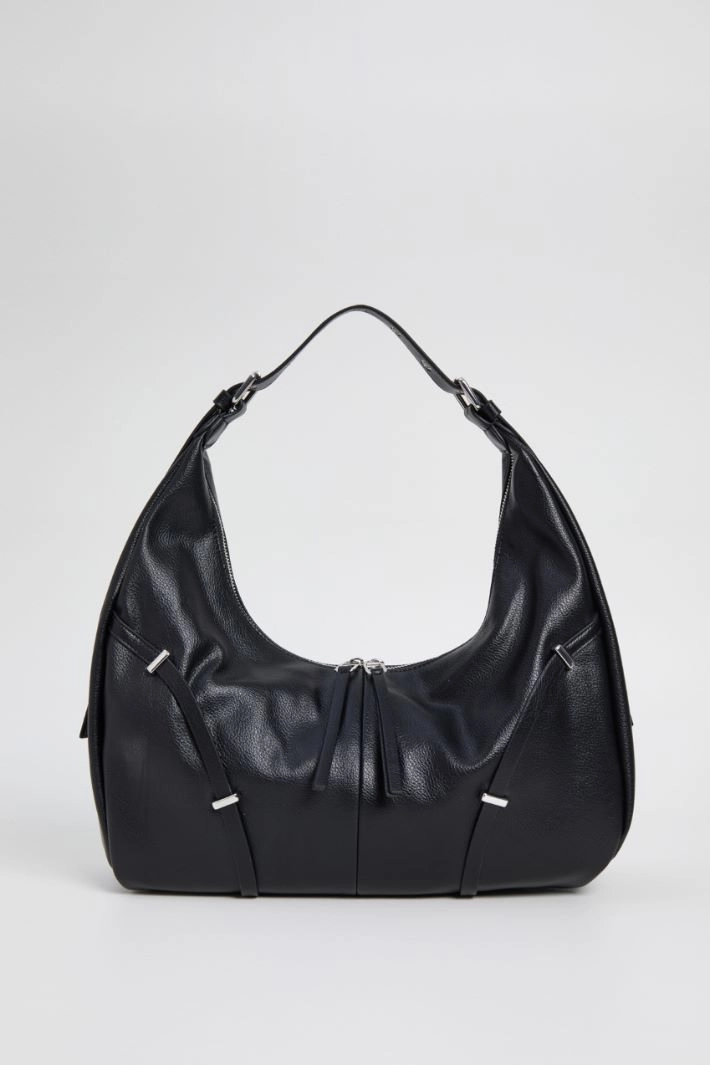 Borsa a spalla realizzata in similpelle dal finish martellato, con manico regolabile rifinito da occhielli in metallo, chiusura tramite zip a doppio cursore. Interno foderato con taschino.