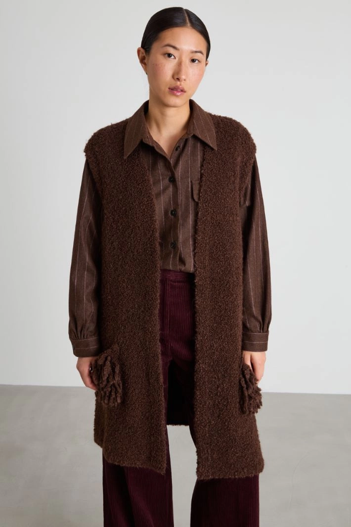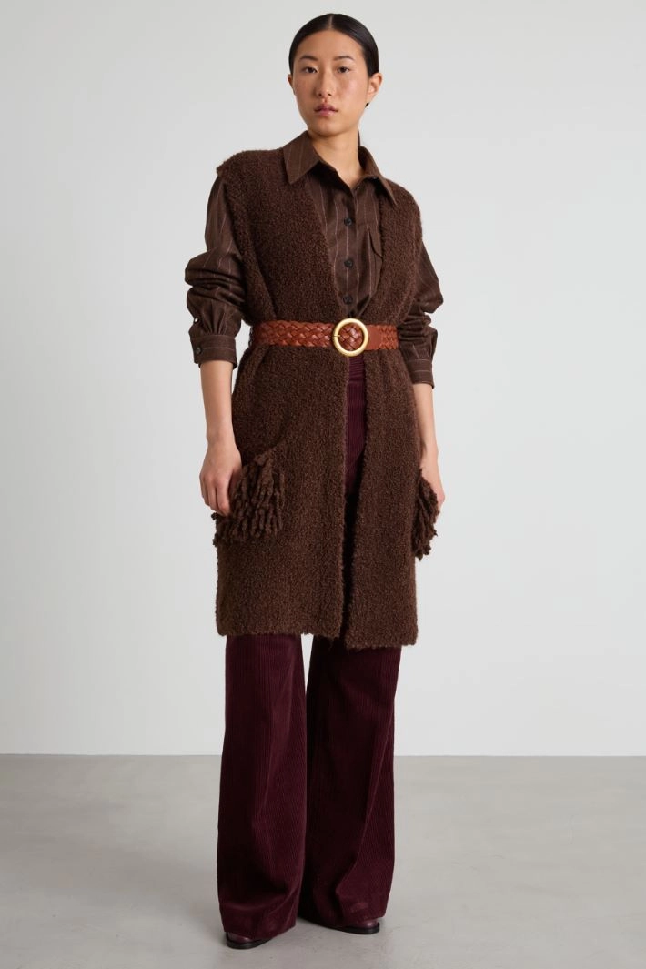 Gilet lungo dalla linea morbida realizzato in filato bouclé, con scollo a V e tasche laterali applicate con frange. Senza allacciatura.