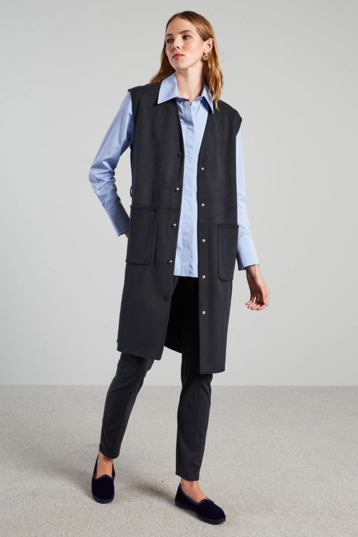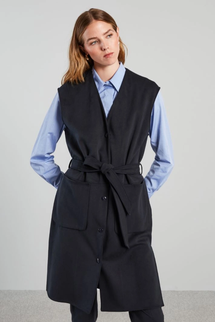 Gilet lungo dalla linea dritta realizzato in jersey stretch dal finish vellutato, con scollo a V, passanti in vita, tasche applicate e spacchi laterali al fondo. Allacciatura monopetto tramite bottoni automatici e cintura coordinata. Sfoderato.