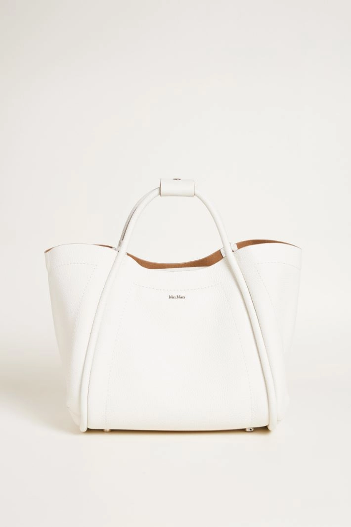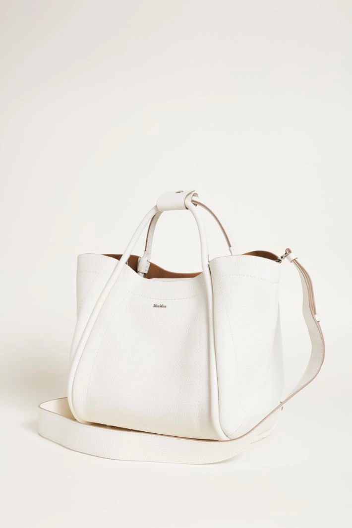 Borsa a mano in pelle effetto bottalato, con motivo impunturato davanti e sui fianchi, manici tubolari, tracolla rimovibile, fianchi ripiegabili con laccio e anella interni. Interno dotato di tasca zip interna. Chiusura a calamita.