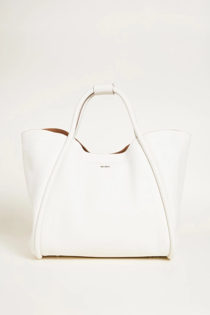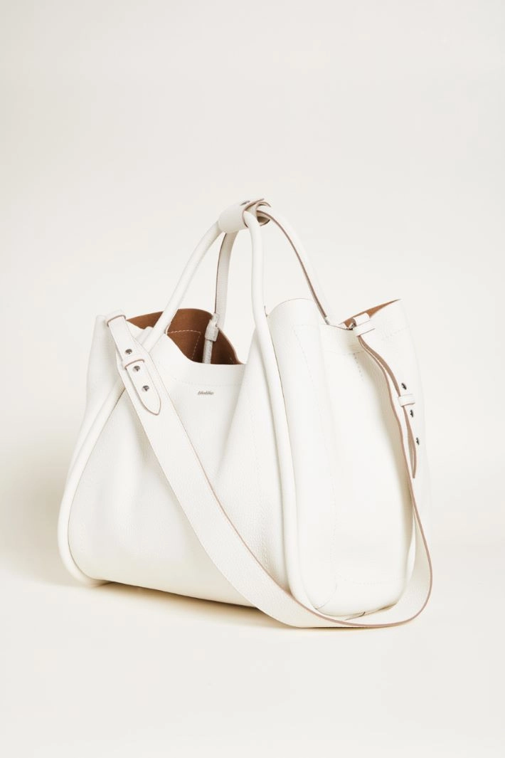 Borsa realizzata in pelle effetto bottalato, con doppio manico tubolare provvisto di passante, tracolla regolabile e rimovibile e tasca interna con zip. Chiusura a calamita.