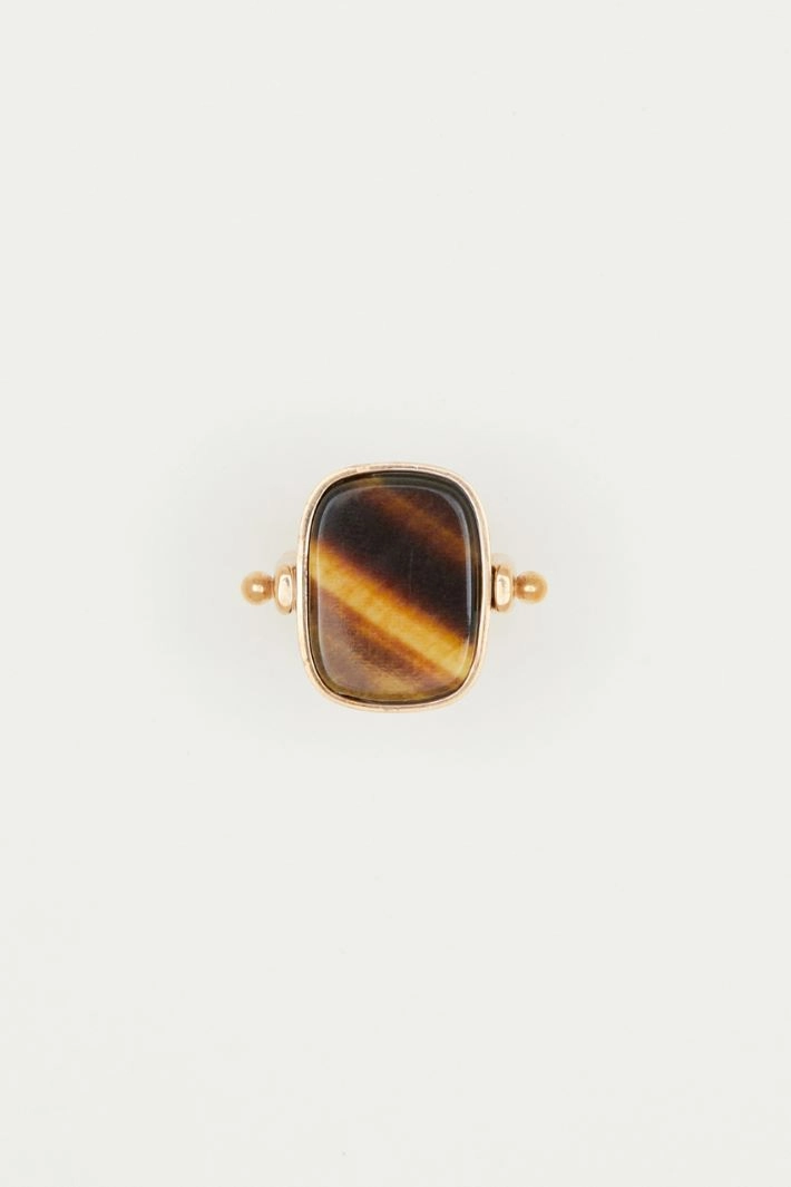 Anello in metallo con texture martellata, piccole sfere laterali e pietra incastonata a contrasto.