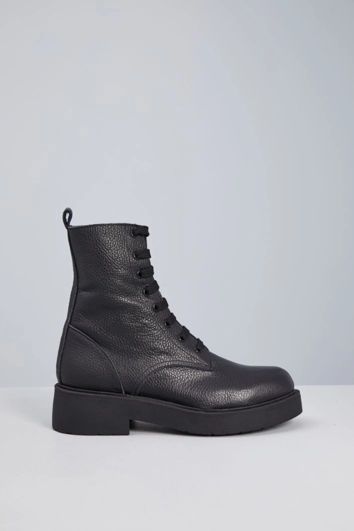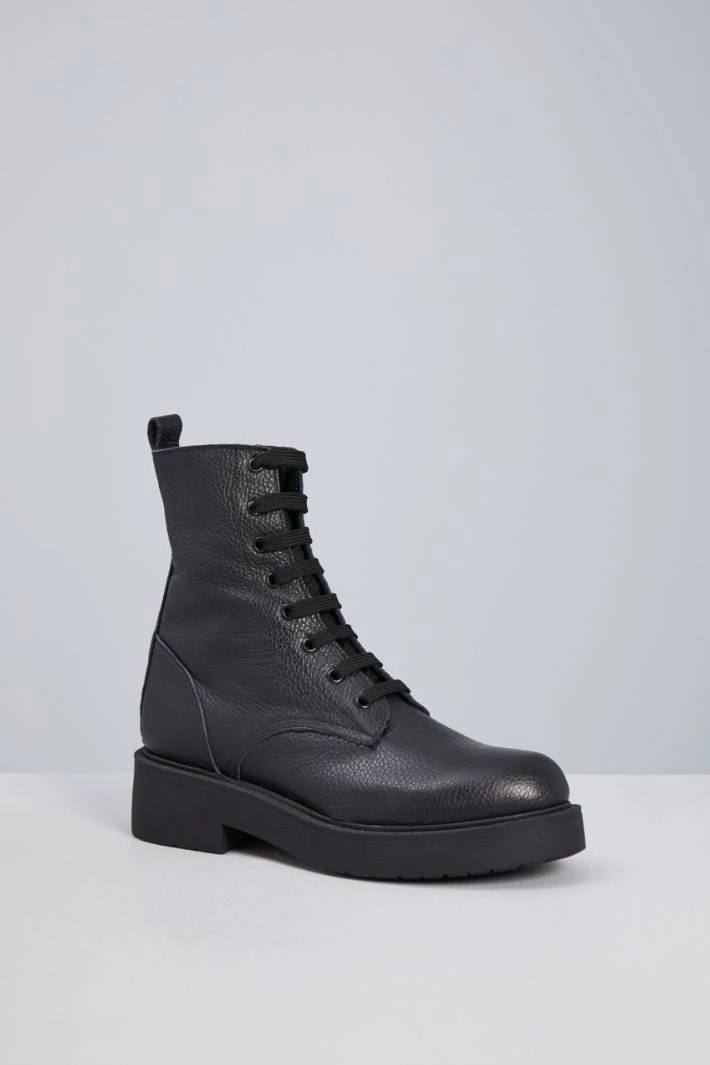 Anfibi realizzati in vera pelle martellata, con punta arrotondata e chiusura con lacci. Fodera in pelle, suola in gomma.