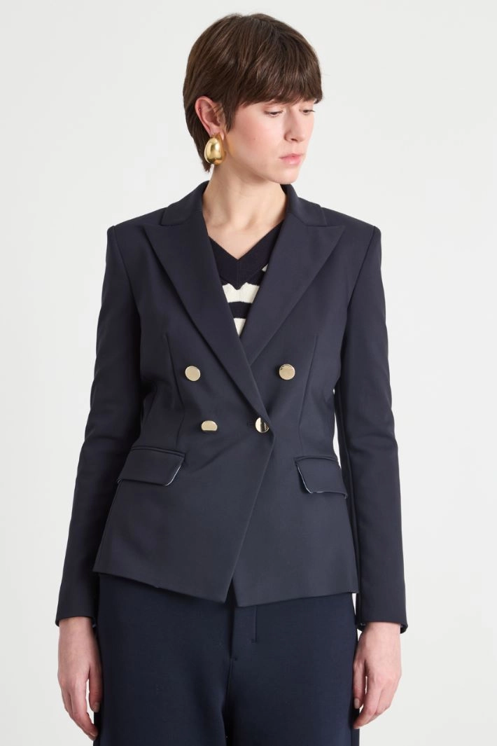 Blazer dalla linea aderente in misto cotone stretch, con rever a lancia, maniche lunghe, tasche laterali con patta. Capo foderato. Chiusura con bottoni.