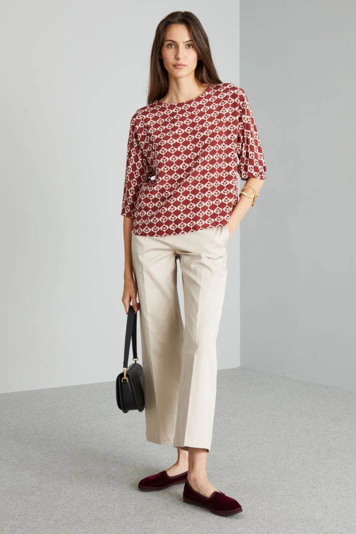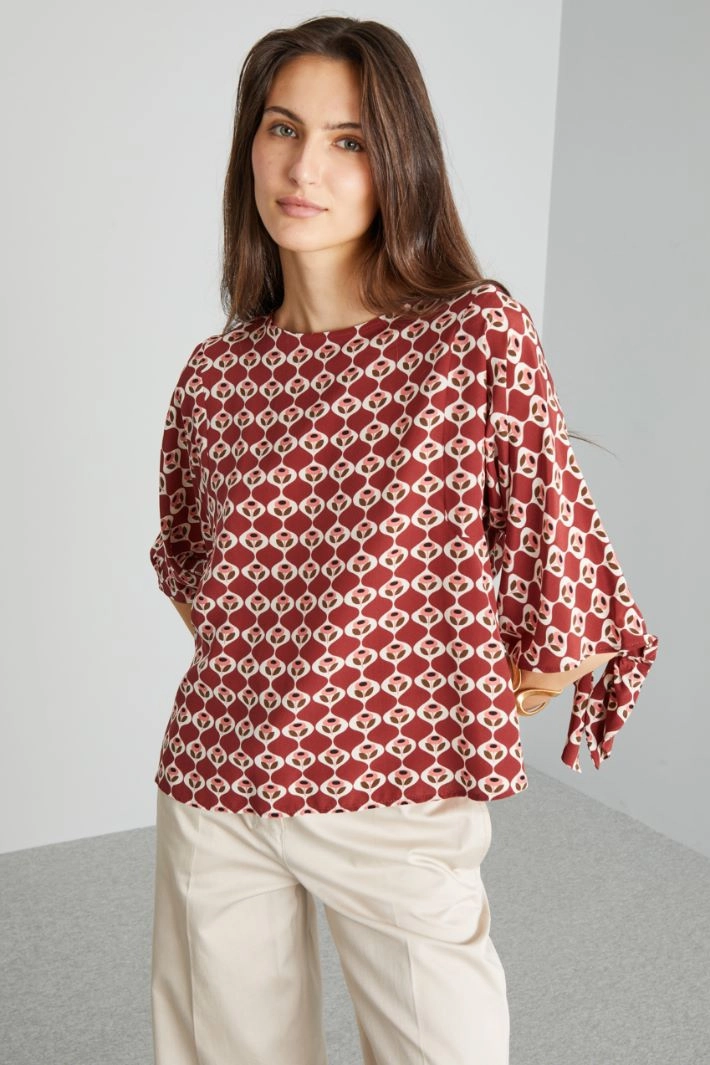 Blusa dalla linea morbida realizzata in crépe de chine di pura seta stampata. Modello con maniche ampie a tre quarti dal motivo annodato al fondo, contropiego al centro dietro e chiusura a goccia con piccolo bottone.