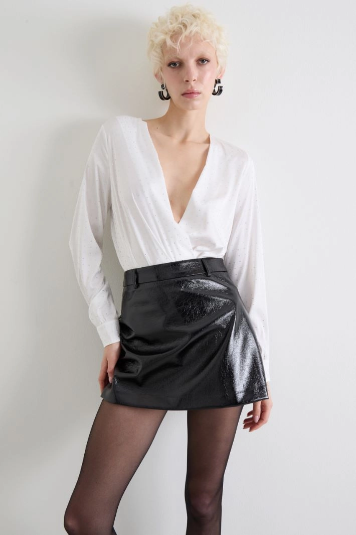Body dalla linea fluida realizzato in raso, con motivo di micro strass applicati, scollo a V incrociato, maniche lunghe con polsino e bottone e allacciatura tramite bottoncini.
