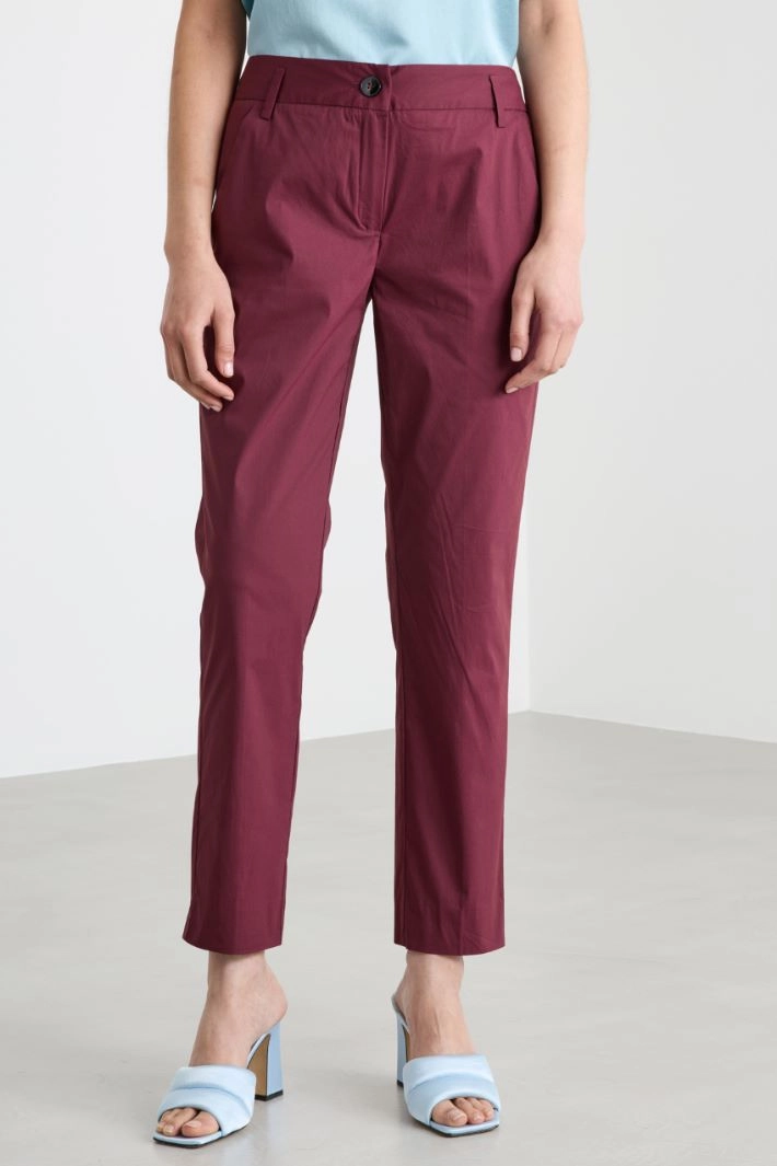 Pantalone chino dalla linea dritta in popeline di misto cotone stretch, con piega stirata davanti e dietro. Taschino posteriore singolo a filetto. Chiusura con bottone e zip.