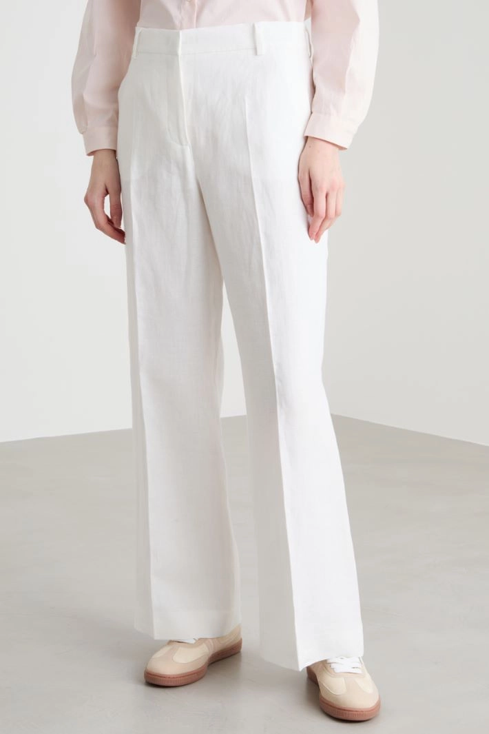 Pantalone dalla linea dritta e ampia in tela di puro lino con piega stirata, passanti in vita, tasche alla francese sul davanti e tasche a filetto con bottone sul retro. Chiusura con zip e gancio.
