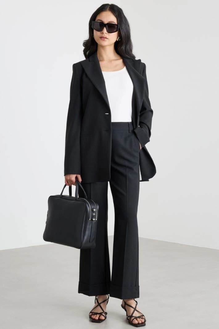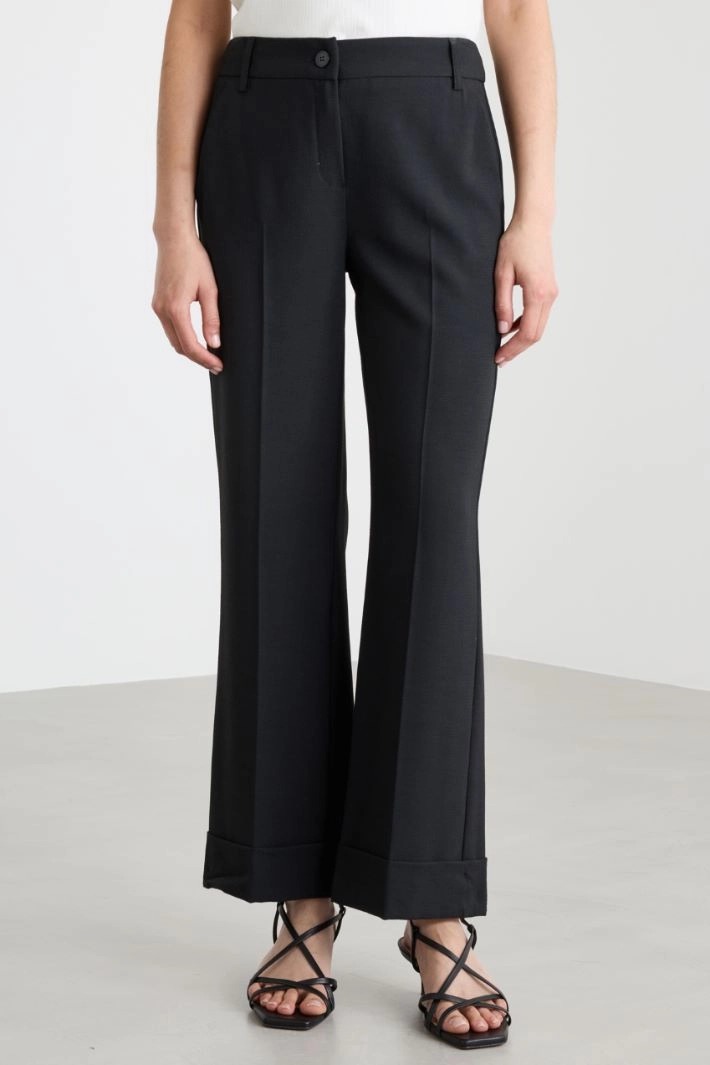 Pantalone dalla linea dritta in misto viscosa stretch armaturata, con tasche alla francese sul davanti e fondo leggermente svasato. Chiusura con bottone e zip.