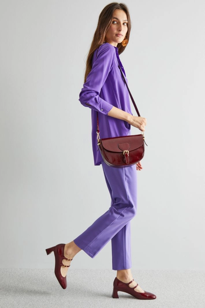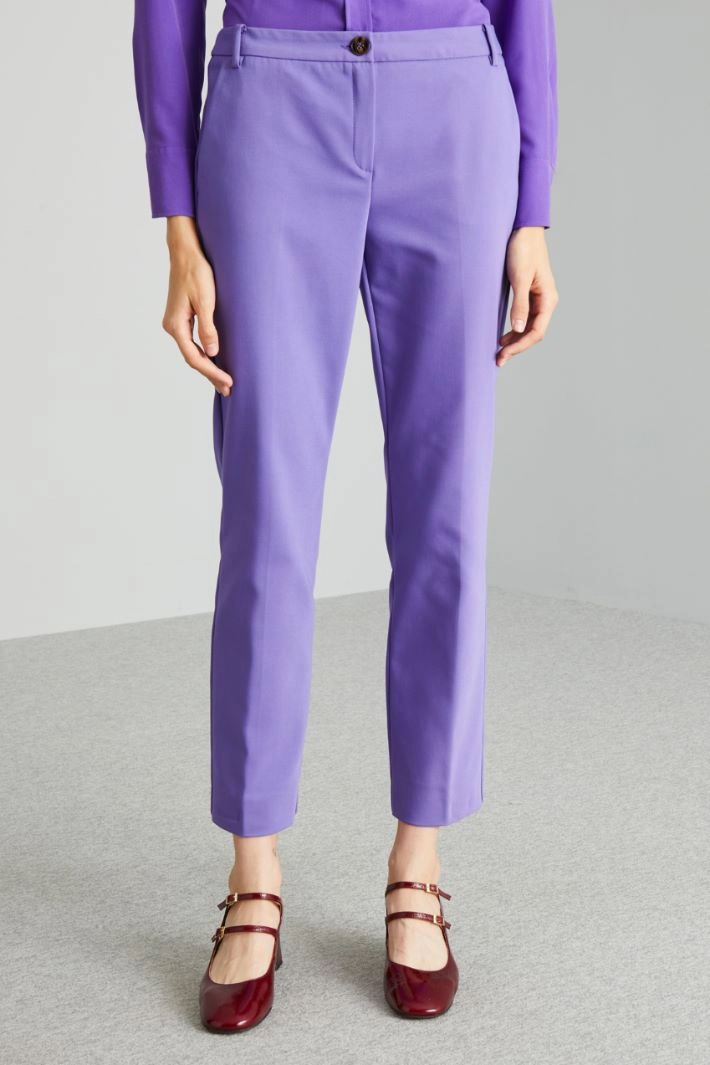 Pantaloni a sigaretta realizzati in tela fluida di misto cotone stretch, con cintone e passanti in vita, tasche alla francese e piega stirata. Allacciatura tramite zip nascosta e bottone.