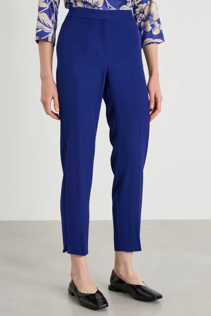 Pantaloni a sigaretta realizzati in tessuto fluido stretch, con tasche laterali alla francese, piega stirata in lunghezza e spacchi laterali a fondo capo. Allacciatura nascosta tramite zip, bottone e gancio.