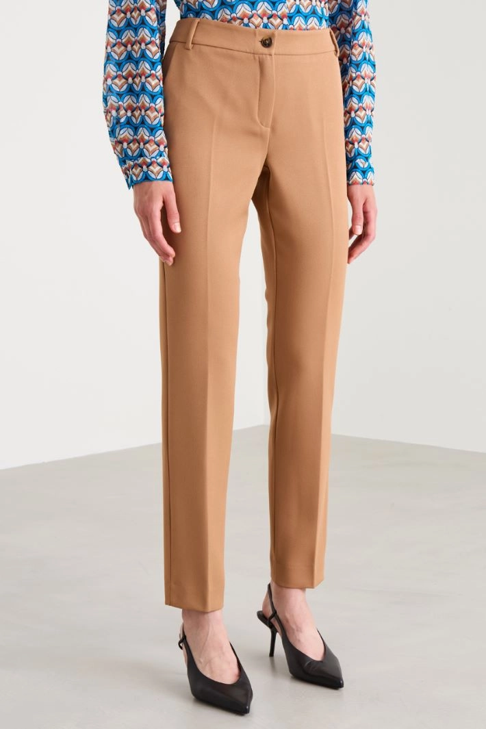 Pantaloni a sigaretta realizzati in tessuto diagonale stretch, con passanti in vita, tasche alla francese davanti, a filetto dietro e piega stirata in lunghezza. Allacciatura tramite zip e bottone.