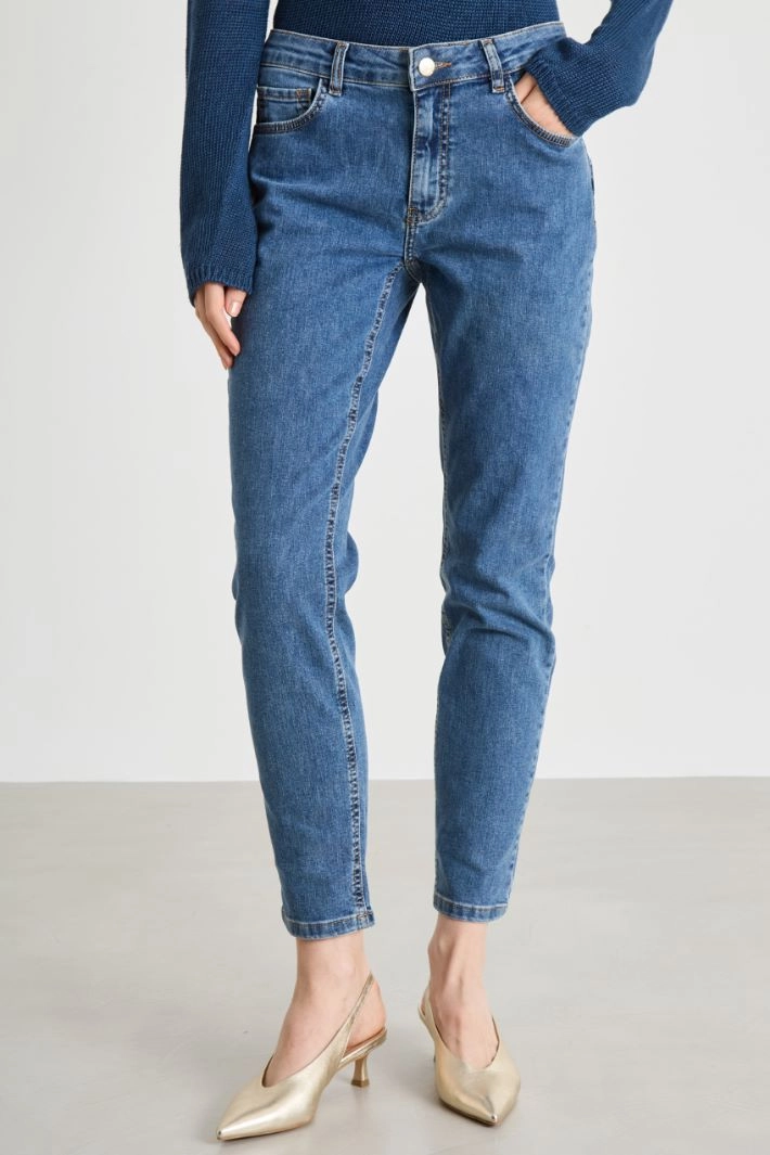 Jeans dalla linea aderente con passanti in vita, tasche arrotondate sul davanti, tasche applicate sul retro. Chiusura con bottone e zip nascosta.