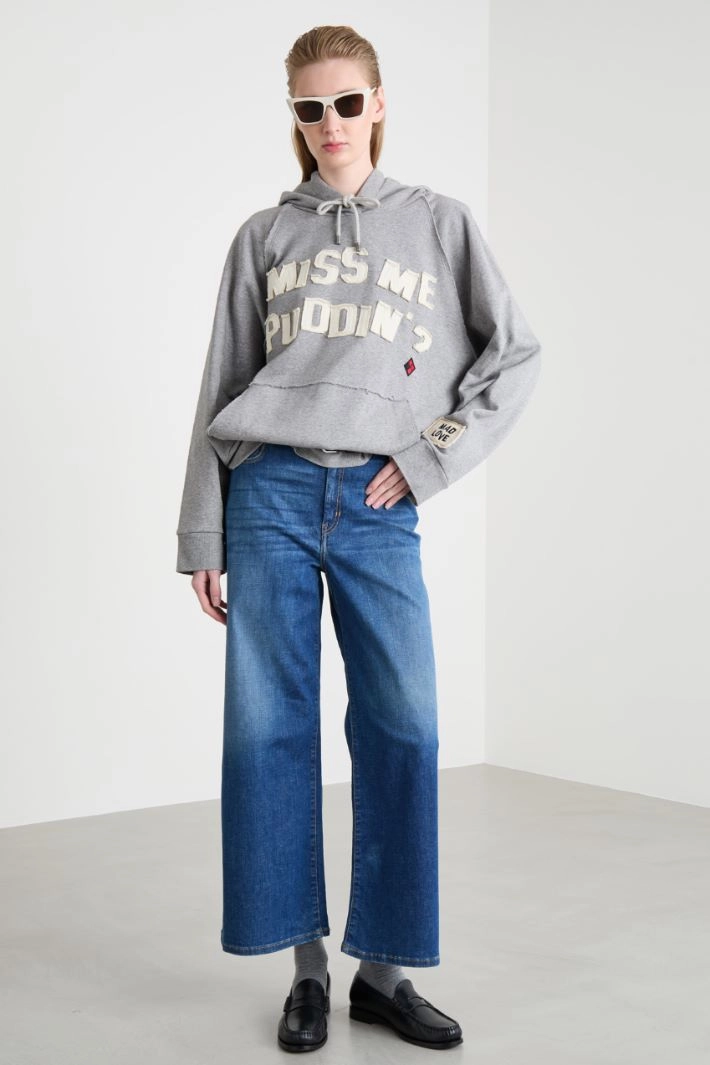 Jeans dalla linea ampia con passanti in vita, tasche arrotondate sul davanti, tasche a applicate sul retro. Chiusura con bottone e zip nascosta.