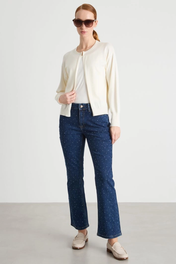 Jeans dalla linea dritta con strass, passanti in vita, tasche arrotondate sul davanti, tasche applicate sul retro. Chiusura con bottone e zip nascosta.