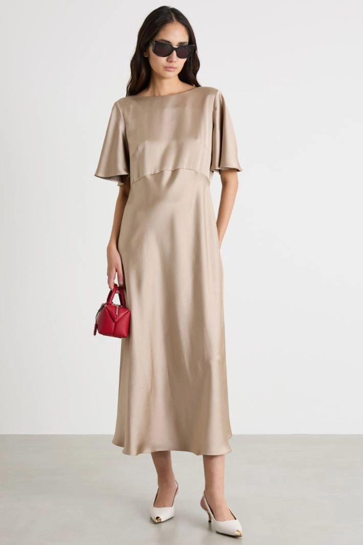 Abito dalla linea scivolata in tessuto effetto raso, con scollo tondo sul davanti e a V sul retro, maniche corte svasate. Chiusura con zip sul retro.
