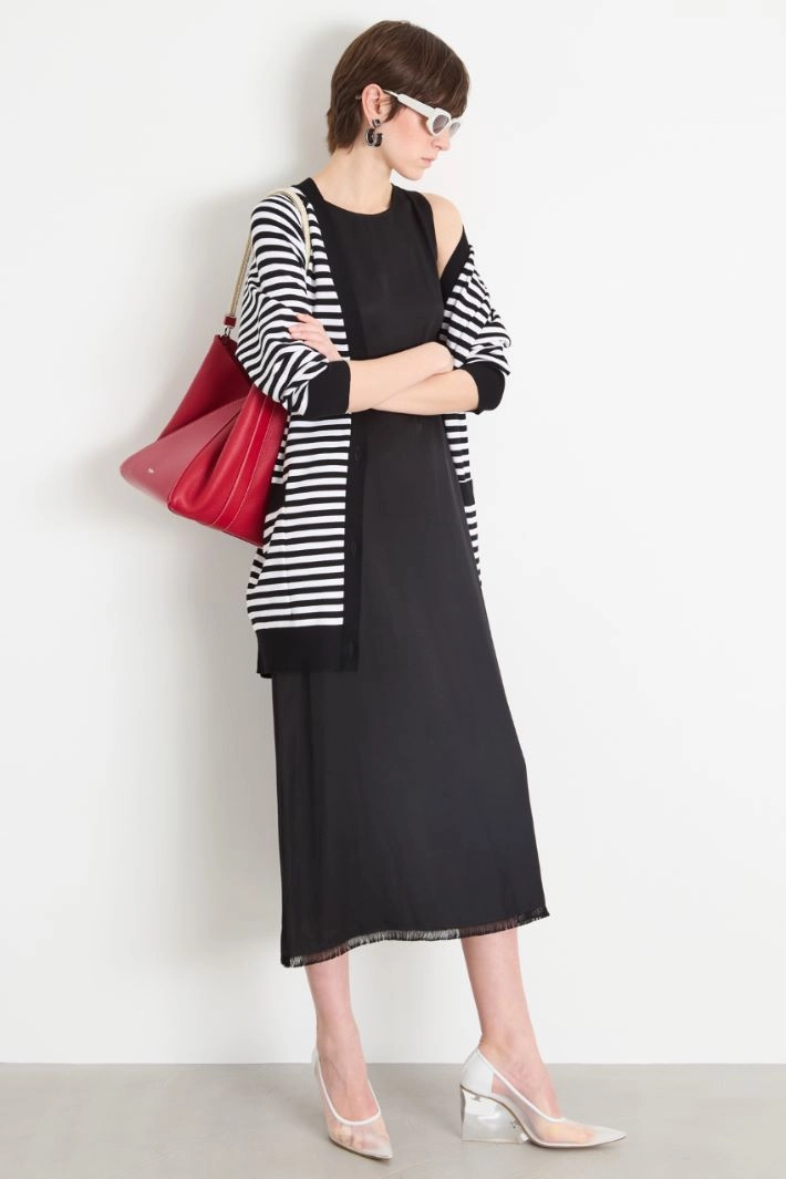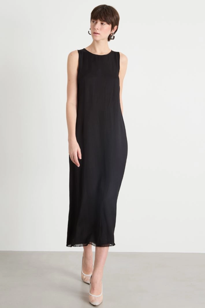 Abito dalla linea dritta in twill di viscosa e lino, con scollo tondo, fondo capo con piccola frangia. Chiusura a goccia con bottone sul retro.