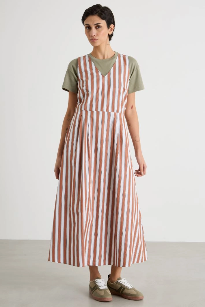 Abito dalla linea svasata in popeline di puro cotone, con scollo a V sul davanti, spalline larghe e taglio in vita con pieghe sulla gonna. Chiusura con zip sul retro.