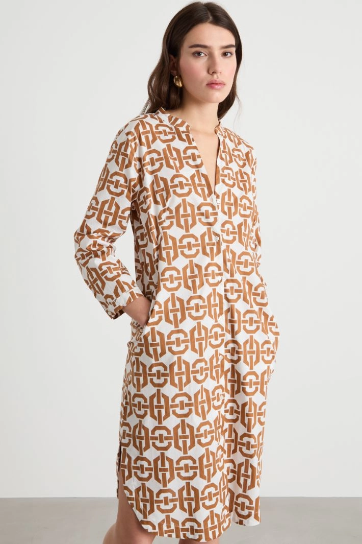 Abito chemisier dalla linea dritta in popeline di cotone stretch con motivo stampato all over, colletto a listino ed apertura a V, maniche a tre quarti con bottone, tasche inserite in cucitura. Fondo stondato con spacchi laterali. Chiusura con bottoni.