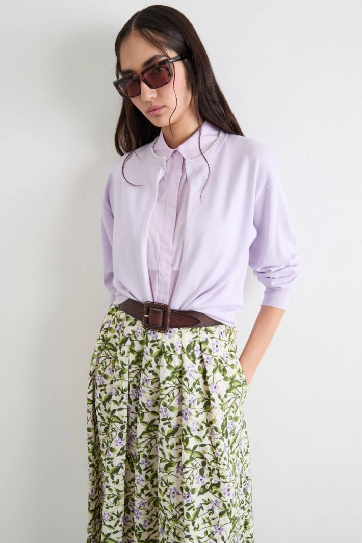 Cardigan dalla linea dritta in viscosa stretch con scollo tondo rifinito da dettaglio di perle applicate, maniche lunghe, polsi e fondo capo a costine.