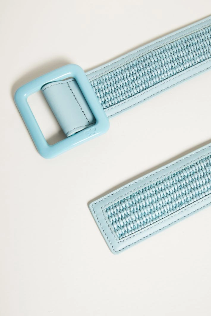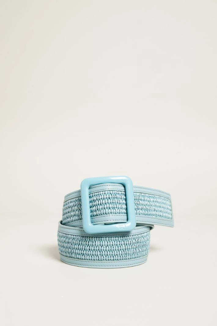 Cintura realizzata in vera pelle, con inserto in tessuto di misto cotone effetto rafia e fibbia squadrata in tono.