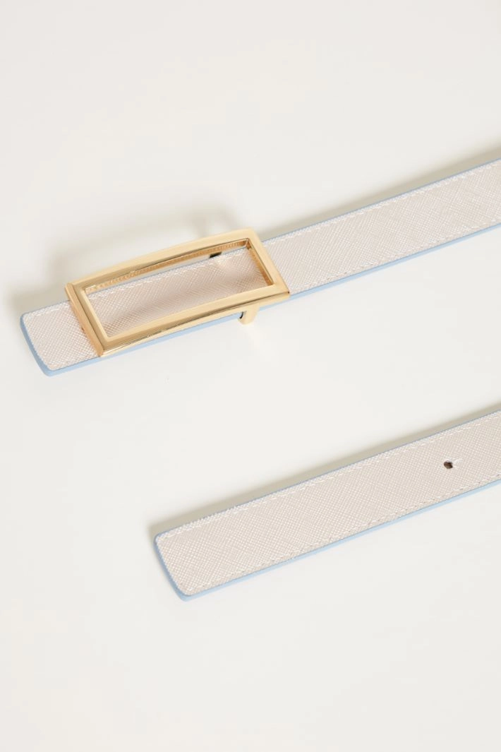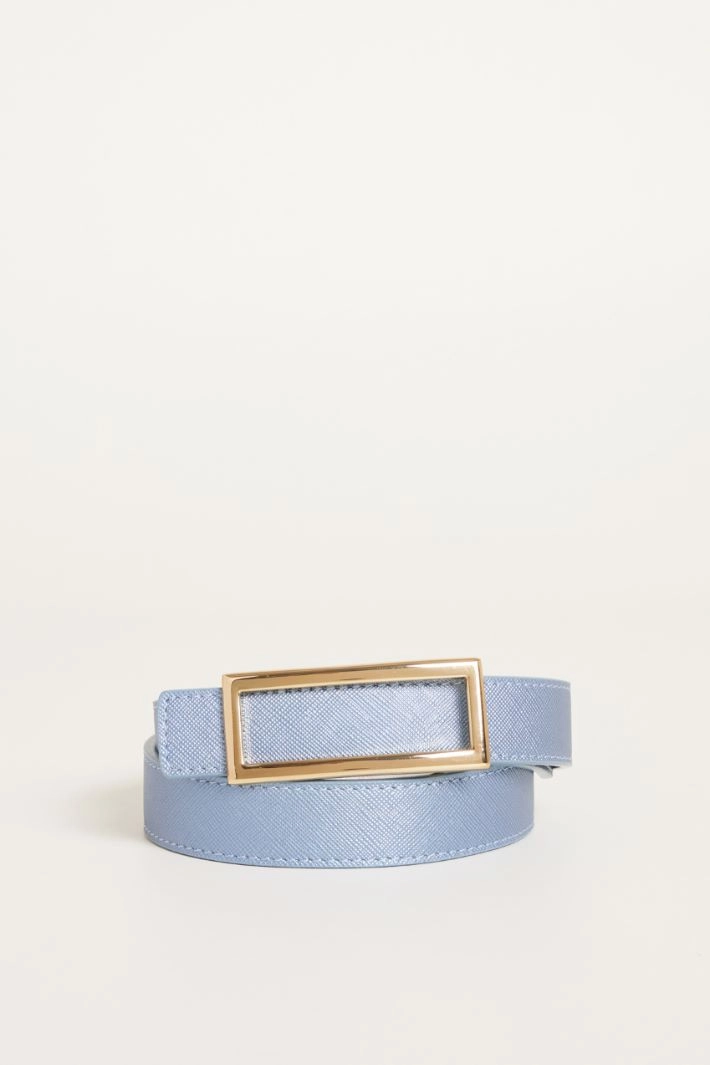 Cintura in tessuto spalmato con finitura saffiano e fibbia rettangolare in metallo.