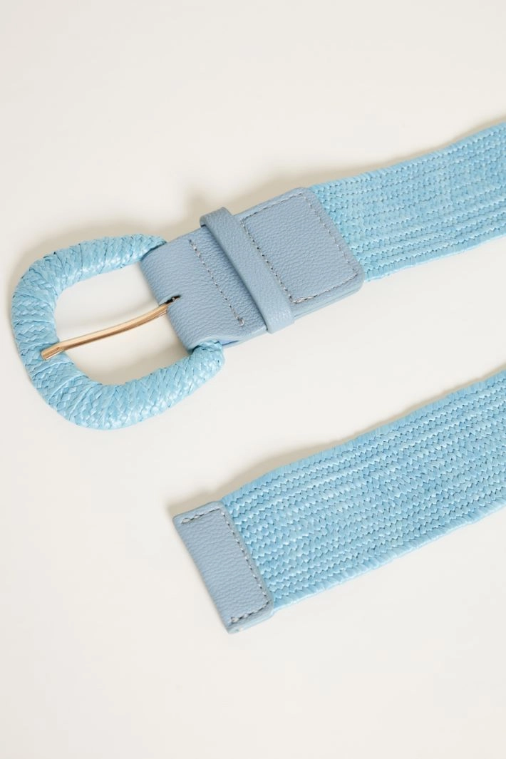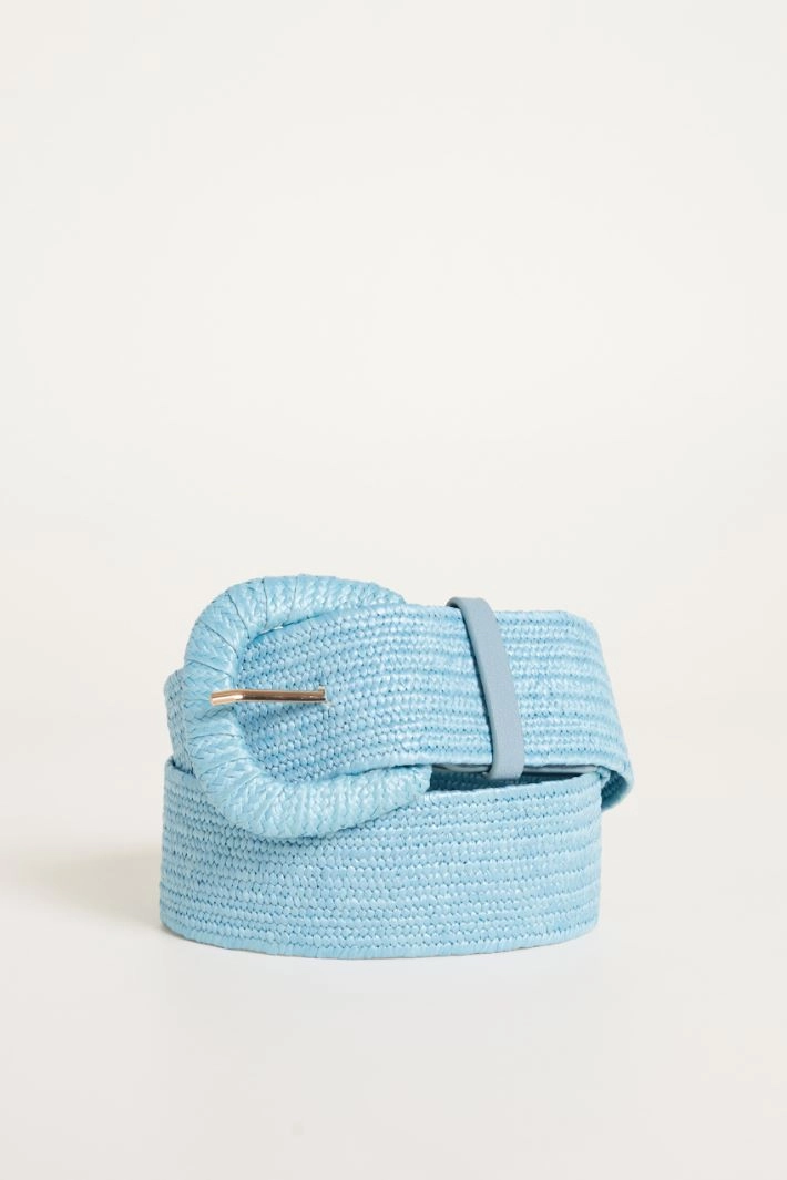 Cintura in rafia stretch con fibbia rivestita con ardiglione.