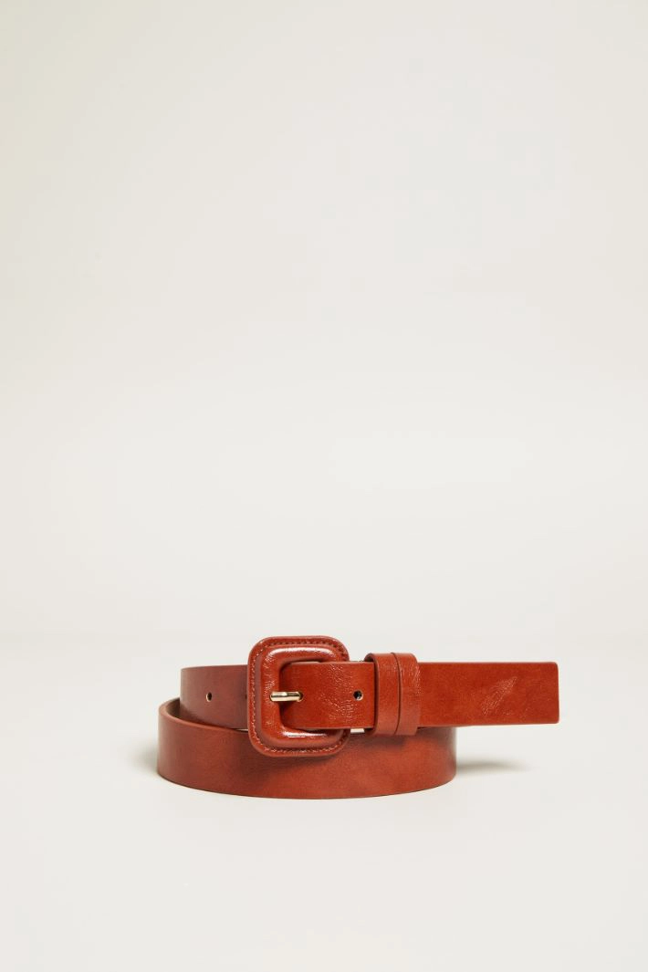 Cintura realizzata in similpelle dal finish lucido con passante doppio, fibbia rivestita e ardiglione in metallo.
