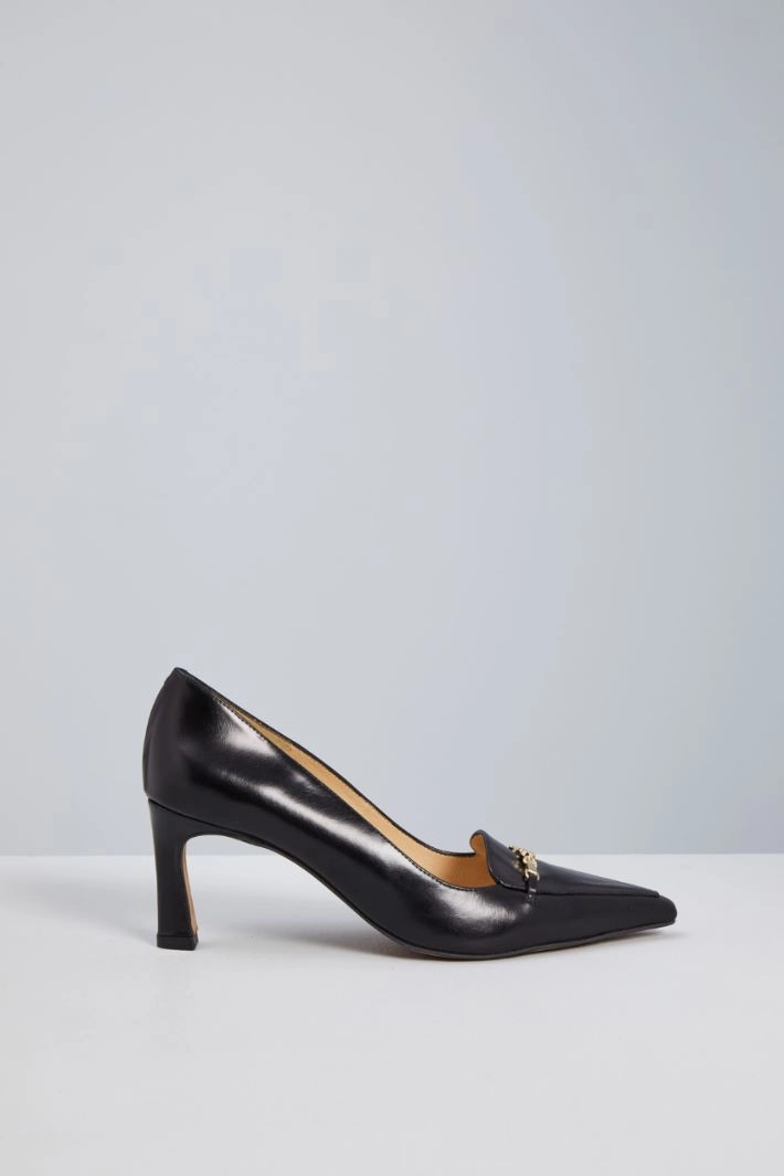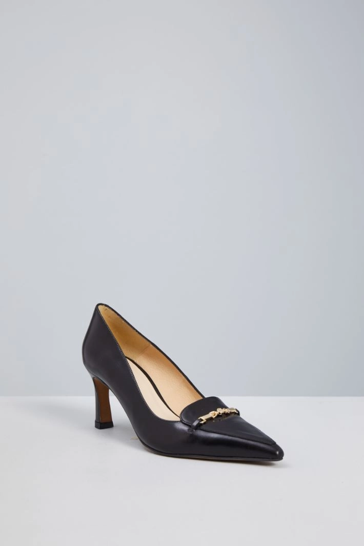 Décolleté realizzate in vera pelle, con punta affusolata e dettaglio di morsetto metallico sulla tomaia. Fodera in pelle, suola in gomma.